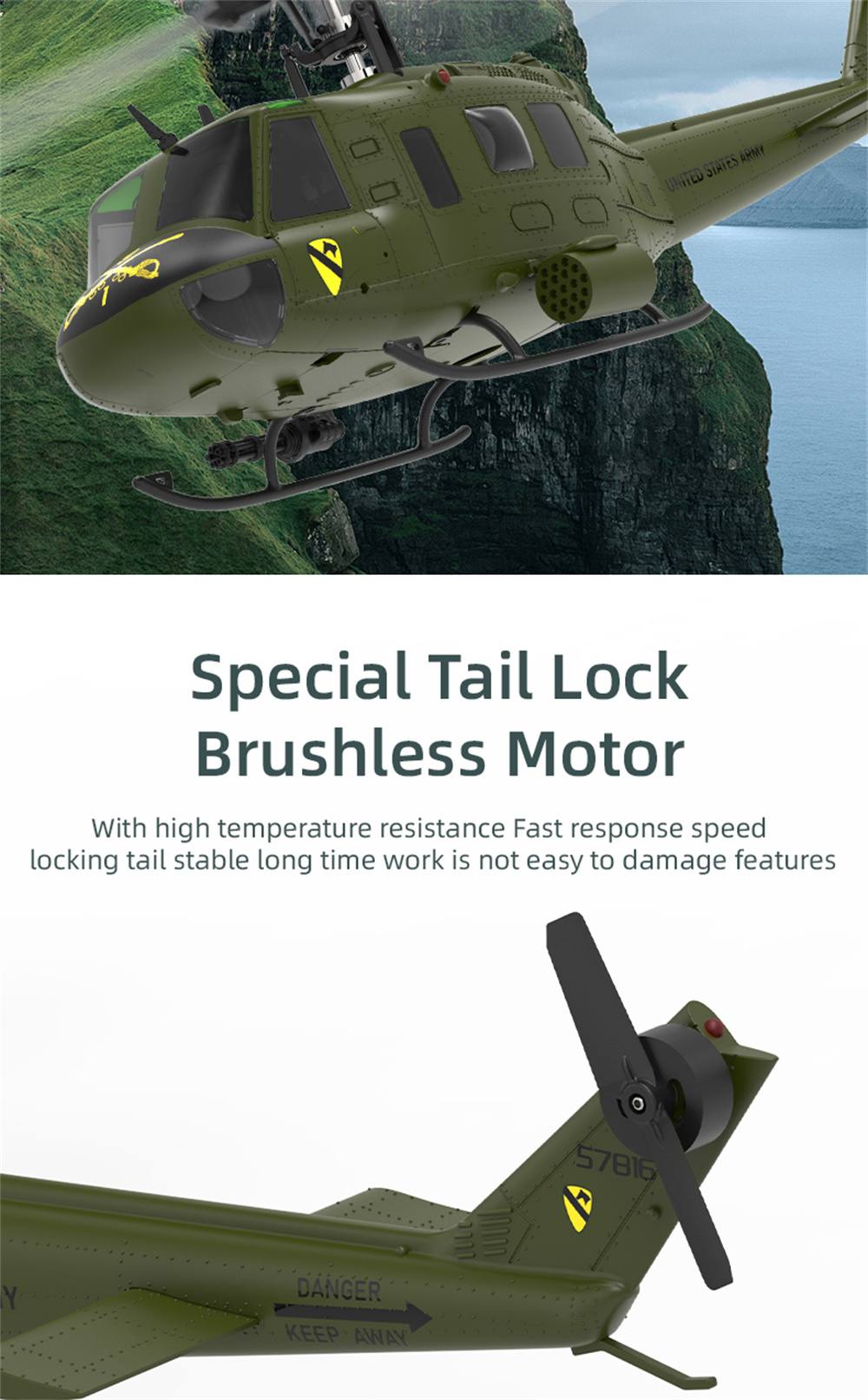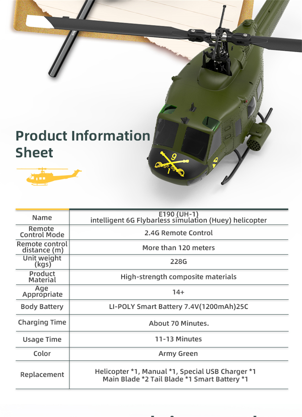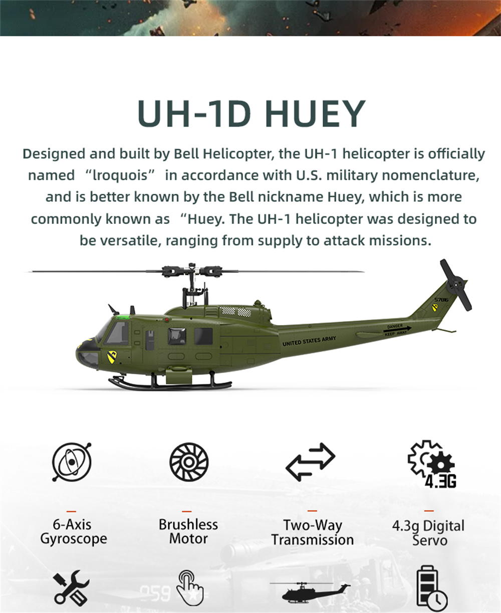 1> Helikopteri on pienennetty 34:1 -mittakaavassa Bell Helicopter Companyn UH-1 Huey -helikopterista. Ulkonäkö on erittäin mittatarkka, ja siinä on yksityiskohtaiset pinnat sekä näyttävät valot.