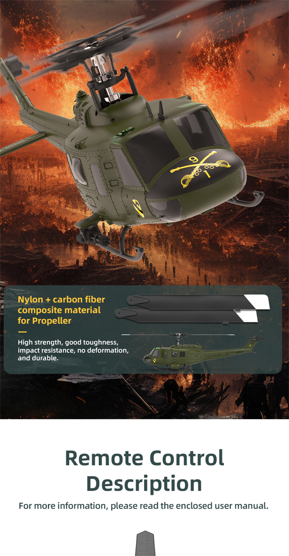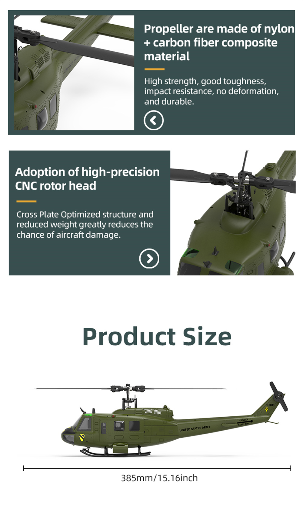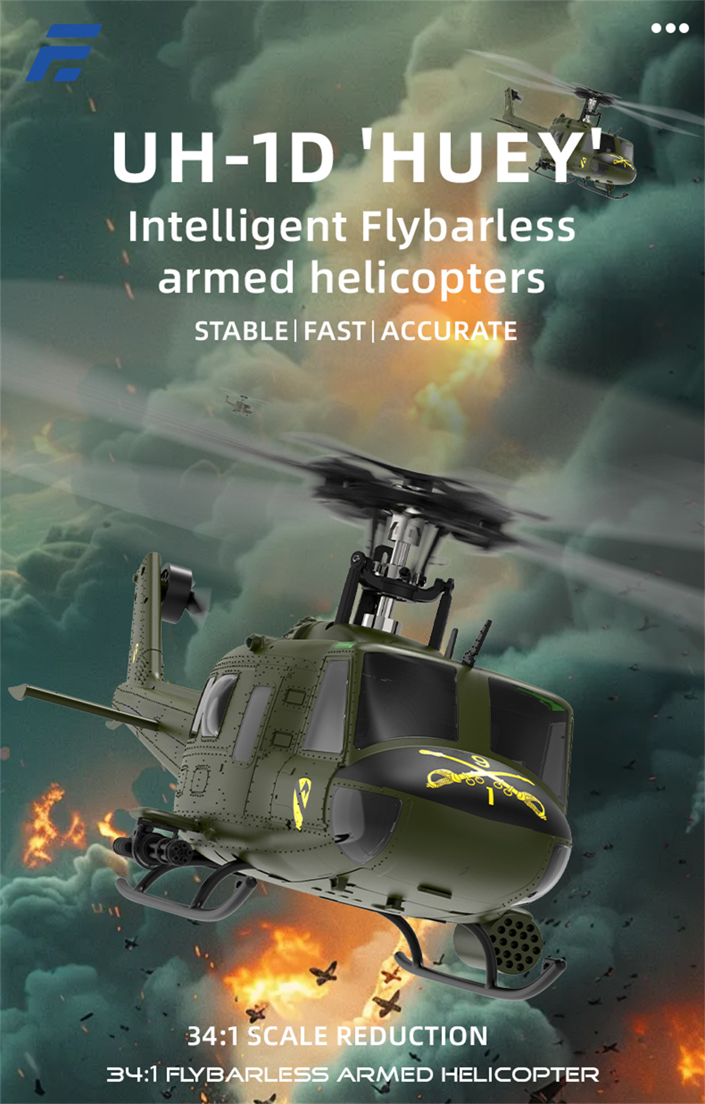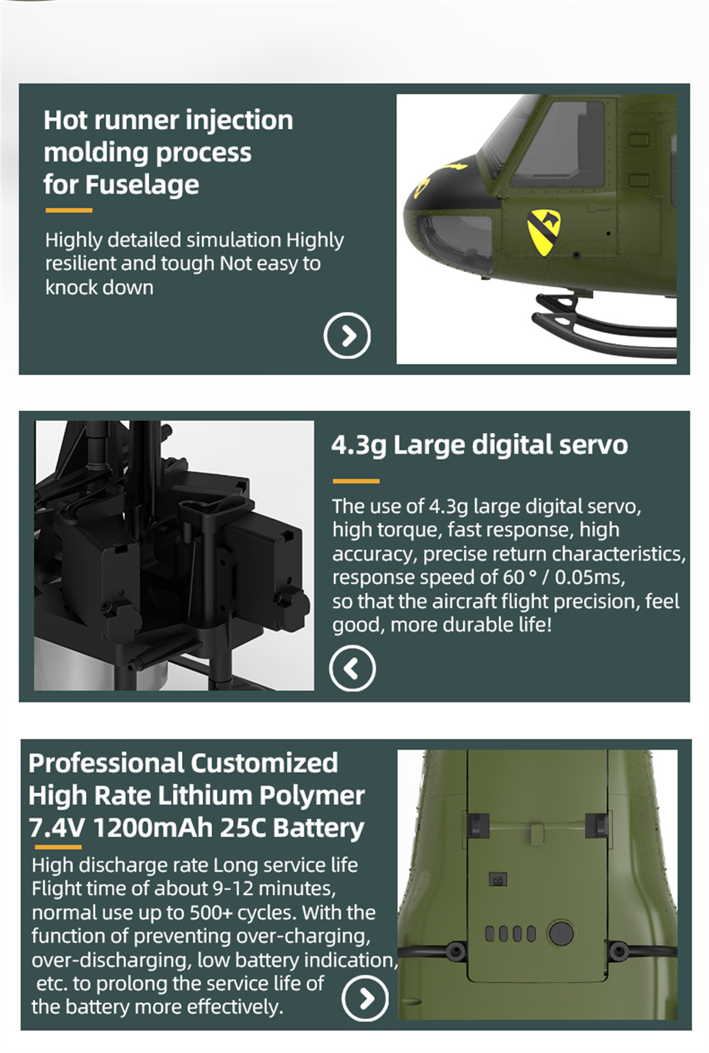 1> Helikopteri on pienennetty 34:1 -mittakaavassa Bell Helicopter Companyn UH-1 Huey -helikopterista. Ulkonäkö on erittäin mittatarkka, ja siinä on yksityiskohtaiset pinnat sekä näyttävät valot.