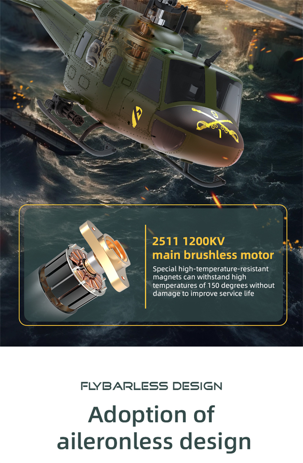 - Flybarless-rakenne, kaksimoottorinen roottorijärjestelmä ja elektroninen vakautus tarkkaan ja vakaaseen lentoon