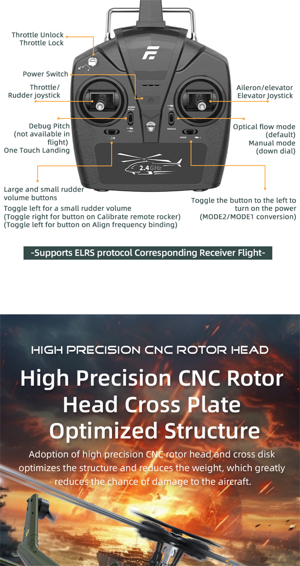 13> Helikopteriin voidaan liittää ELRS-vastaanotin, ja se on yhteensopiva markkinoilla olevien avoimen lähdekoodin kauko-ohjainten kanssa.