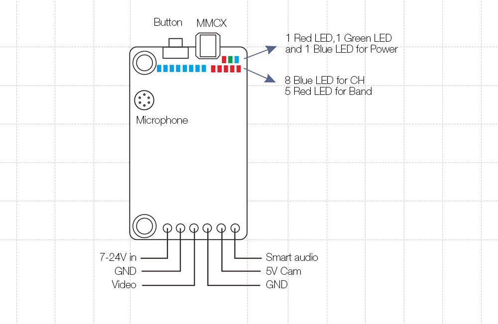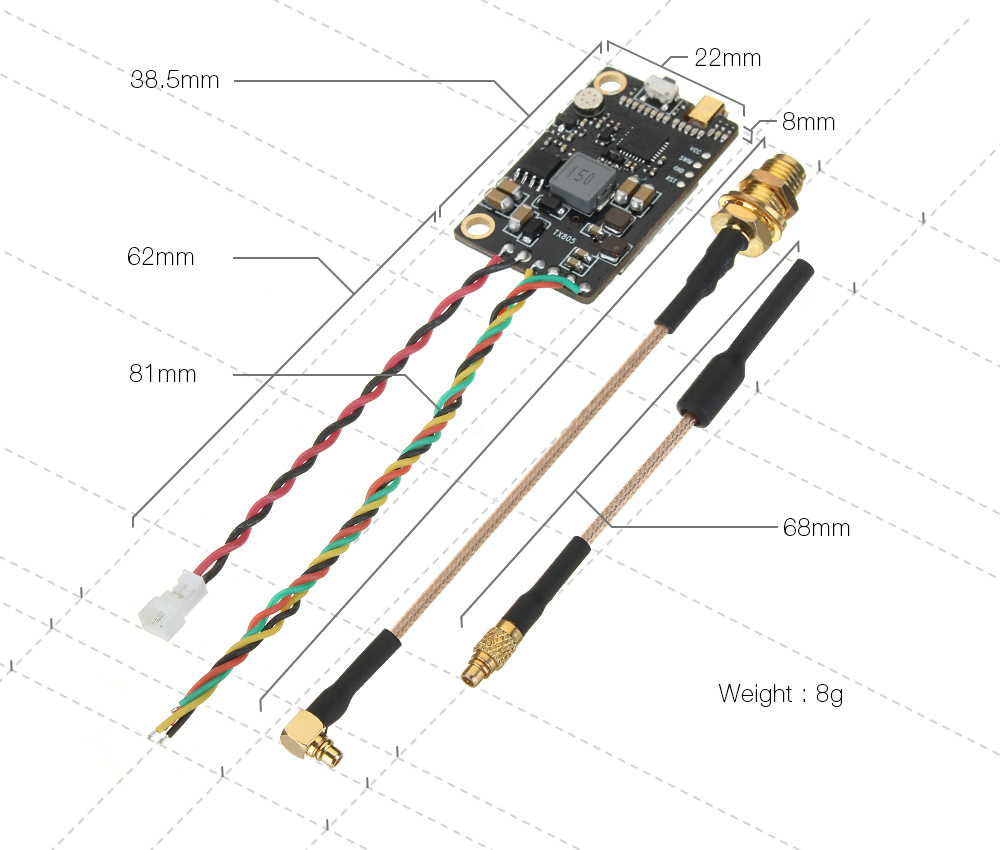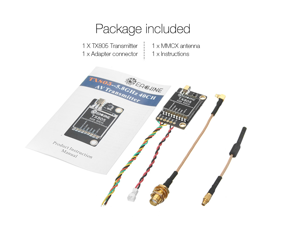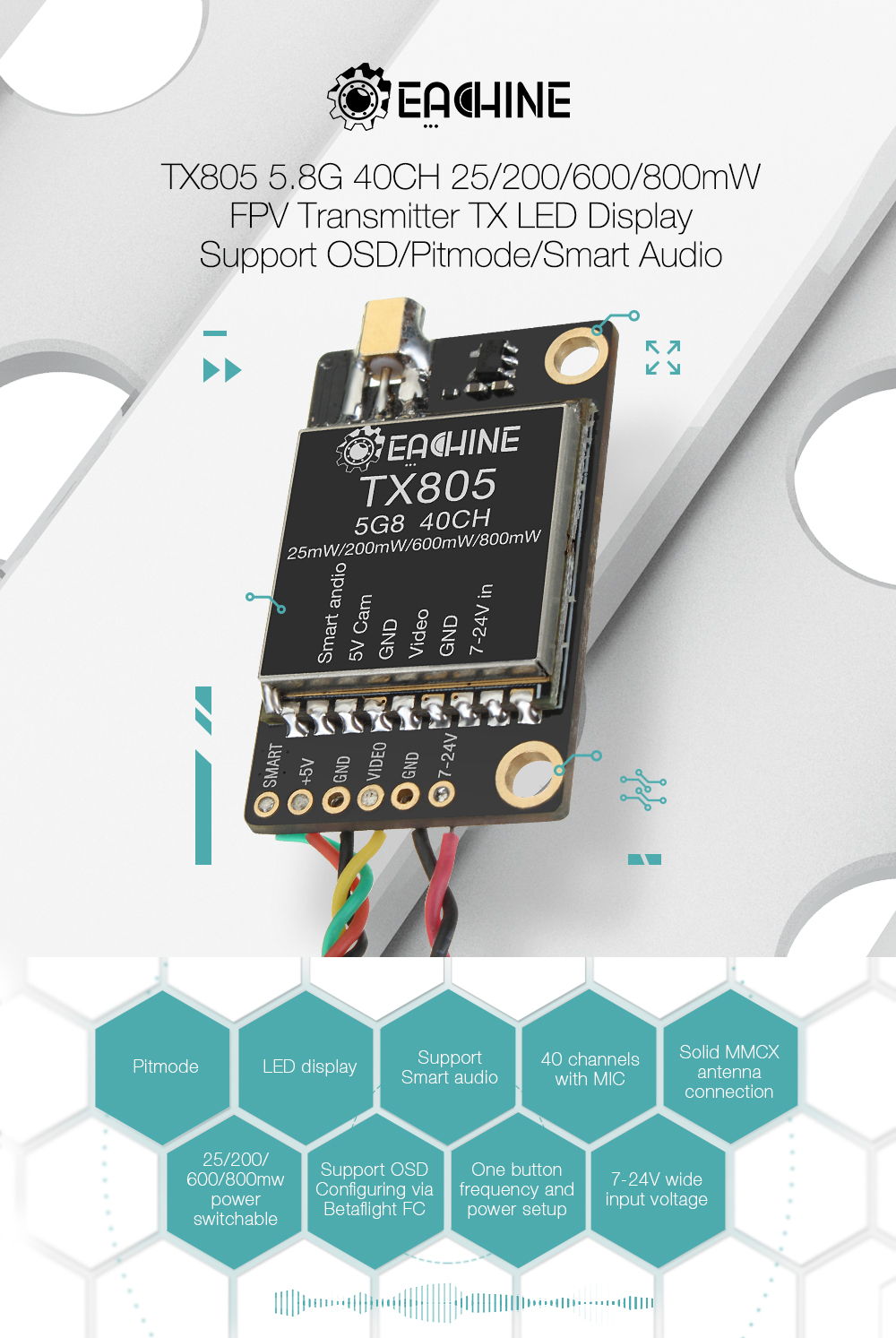 Eachine TX805 on kompakti ja monipuolinen 5.8G FPV-lähetin (VTX), joka tarjoaa laajan tehoalueen, Smart audio -tuen sekä kätevän yhden painikkeen ohjauksen taajuuksille ja lähetysteholle. Soveltuu hyvin monenlaisiin FPV-kokoonpanoihin 7V–24V käyttöjännitealueensa ja 30.5 stackattavan asennusreiän ansiosta.