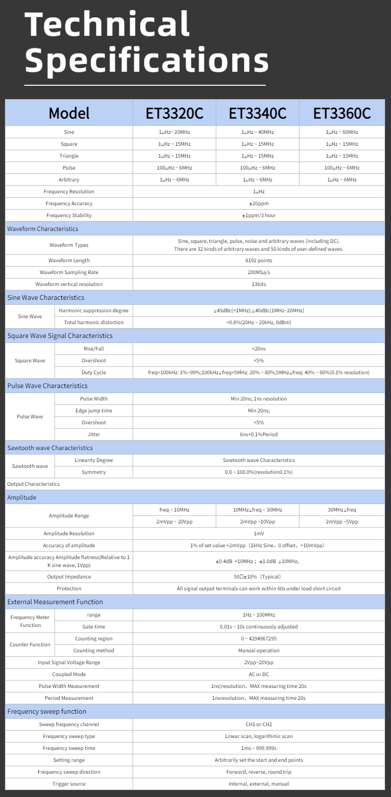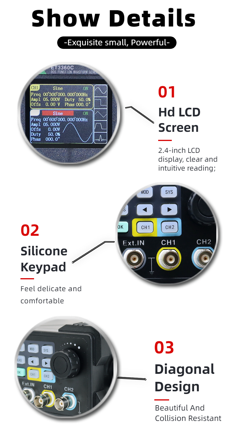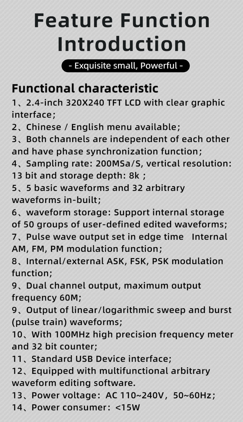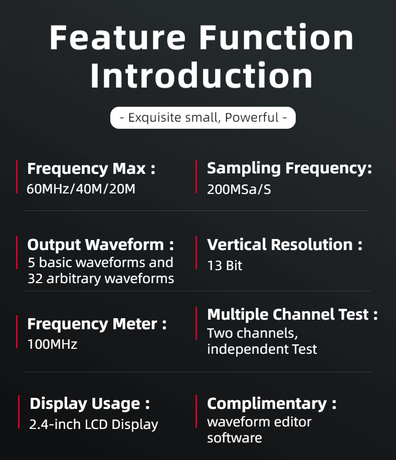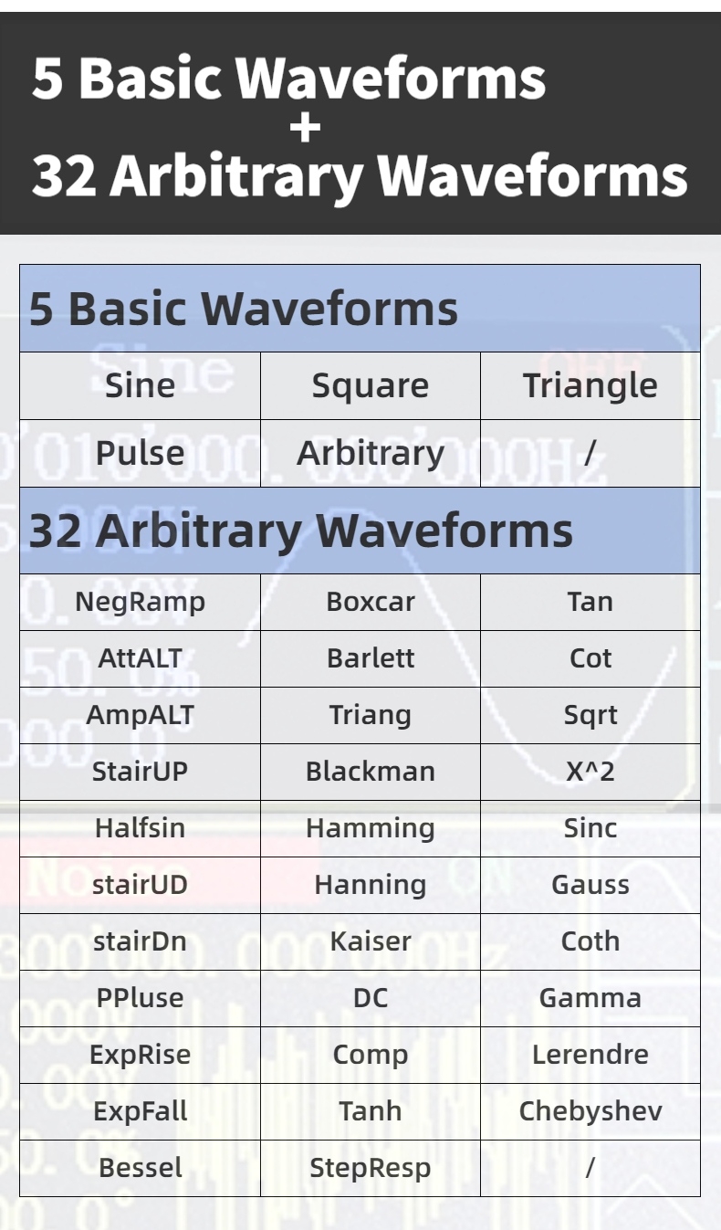Kompakti kahden kanavan aaltomuotogeneraattori, jossa on selkeä 2.4-tuumainen TFT LCD -näyttö ja helppokäyttöinen graafinen käyttöliittymä. Soveltuu laboratorioihin, opetuskäyttöön sekä elektroniikan testaukseen, kun tarvitaan tarkkoja signaaleja ja monipuolisia modulaatio- ja pyyhkäisytoimintoja.
