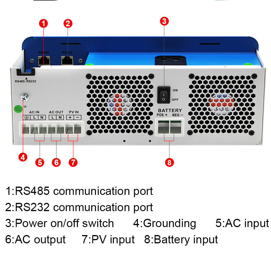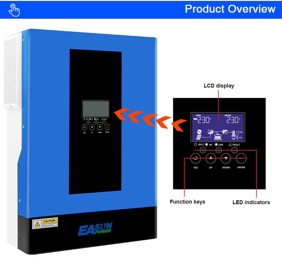 5. Selkeä valvonta: Näyttöruutu näyttää reaaliaikaisesti akun, invertterin ja kuorman tilan, mikä helpottaa järjestelmän seurantaa ja käyttöä.