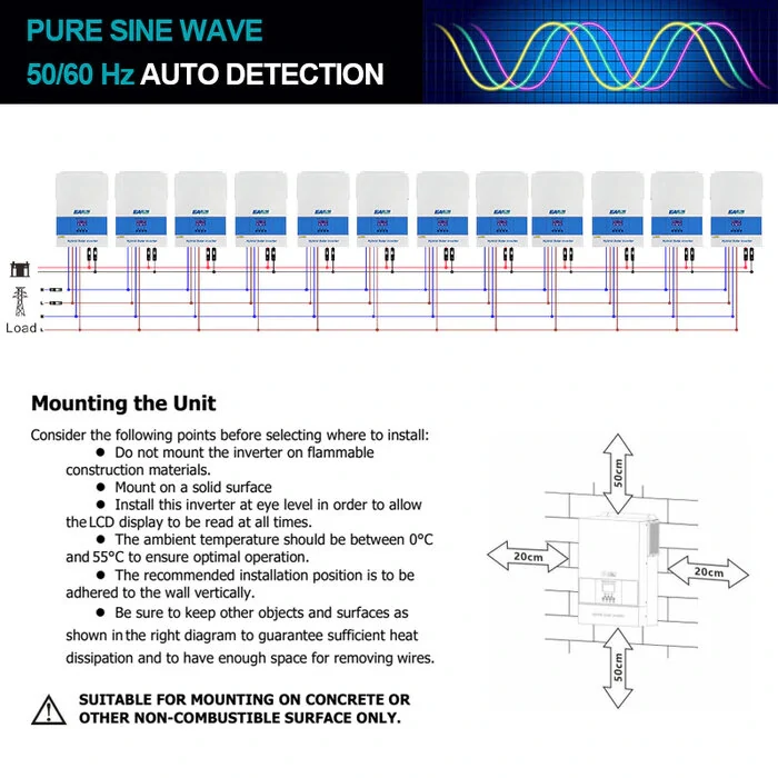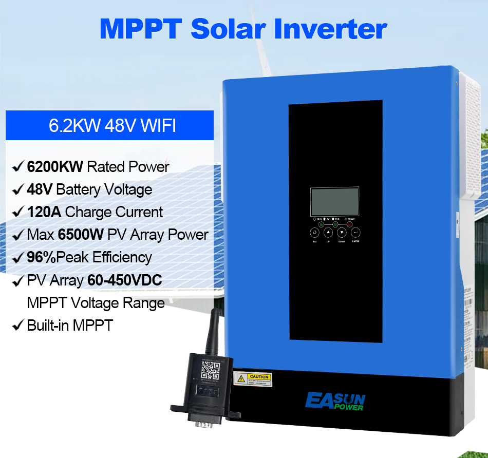 1. 6200W invertteri: EASUN POWER 6200W puhdas siniaalto -invertteri muuntaa tehokkaasti 48V tasavirran 220V–230V vaihtovirraksi. Se tuottaa puhtaan, vakaan ja vähäkohinaisen sähkön kaikille laitteille, mikä tukee niiden pitkäaikaista ja luotettavaa toimintaa.