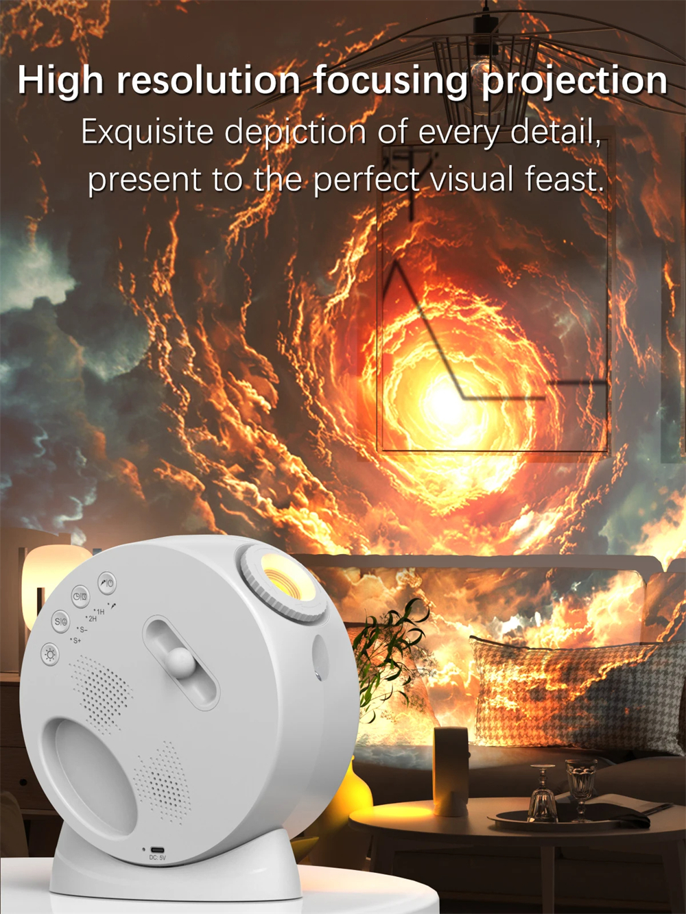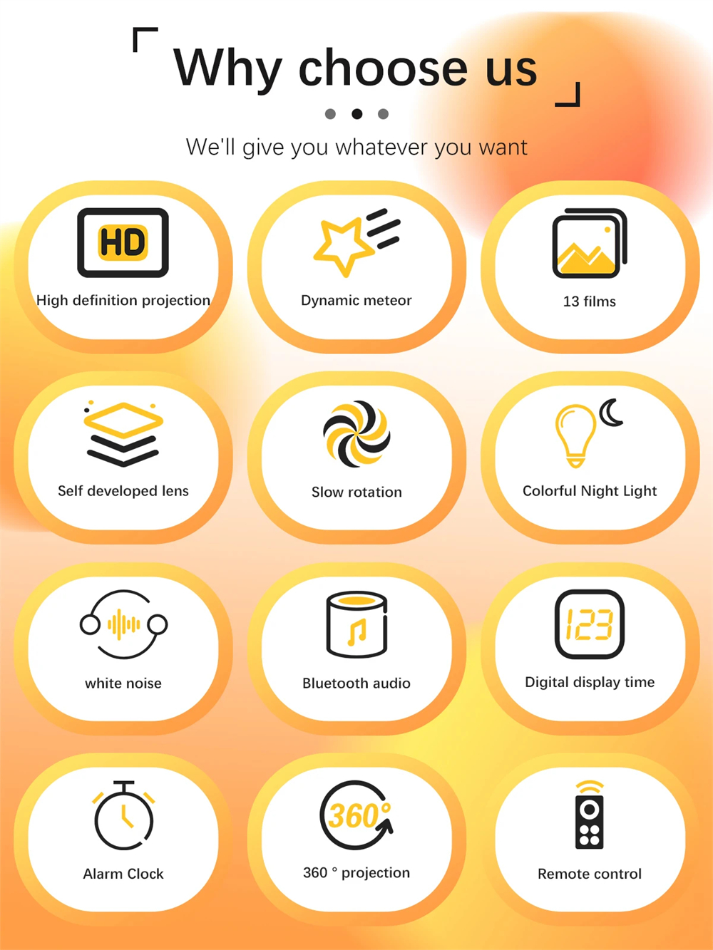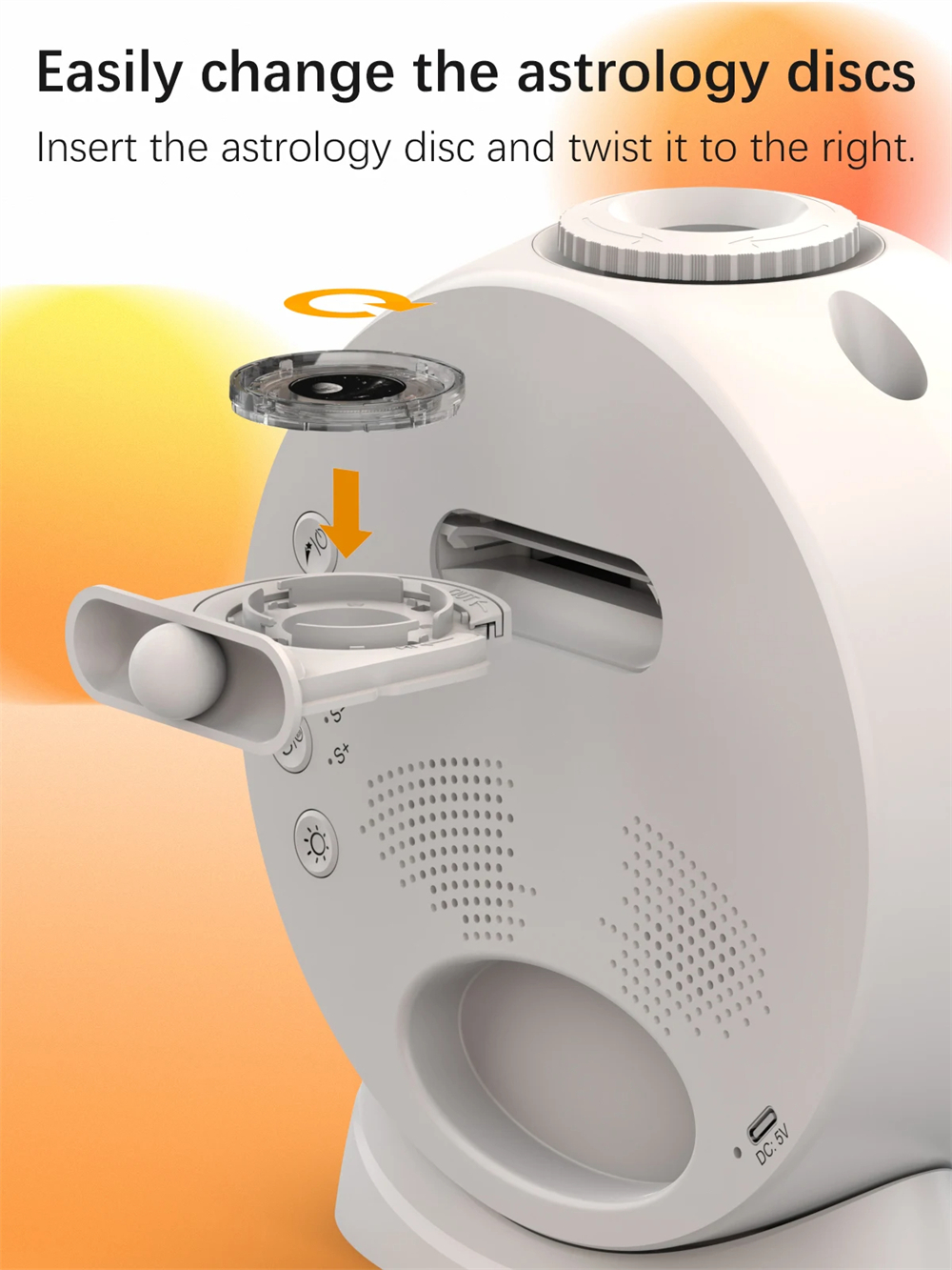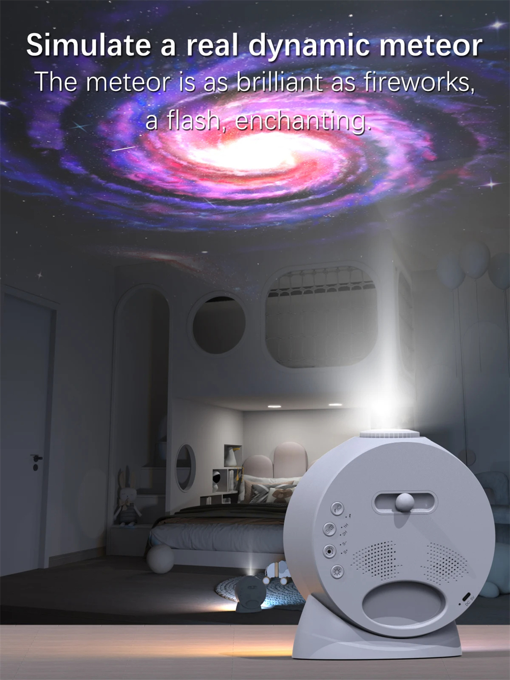 Tähtiprojektori ja herätyskello, jossa on langaton kaukosäädin, LCD-näyttö ja Bluetooth 5.4 -kaiutin. Laite projisoi laadukkaita tähtikarttoja 13 teemafilmillä, sisältää yövalotoiminnon sekä uniääniä rauhoittavaa tunnelmaa varten.