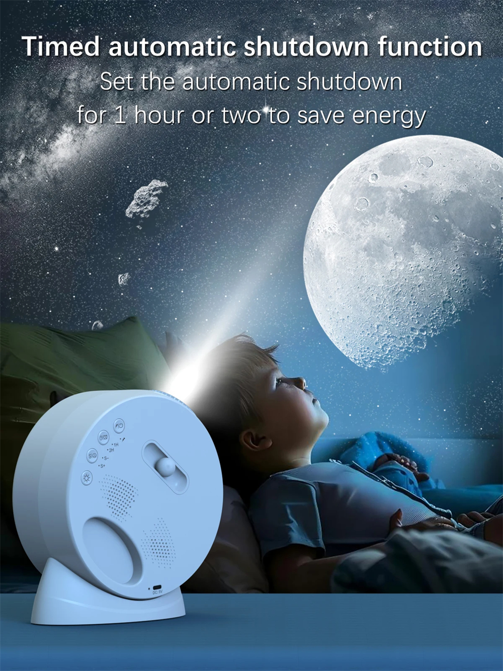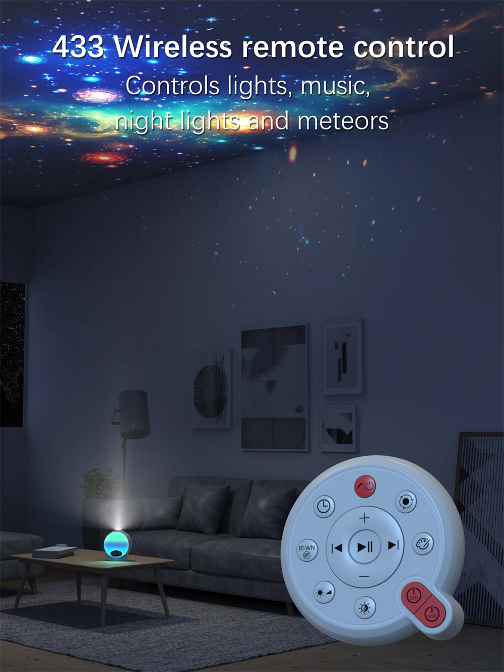 – Langaton kaukosäädin ja automaattinen sammutus: Ohjaa valoja, musiikkia, yövaloa ja meteoriefektejä vaivattomasti kaukosäätimellä. Ajasta automaattinen sammutus 1 tai 2 tunnin päähän energiankulutuksen vähentämiseksi.