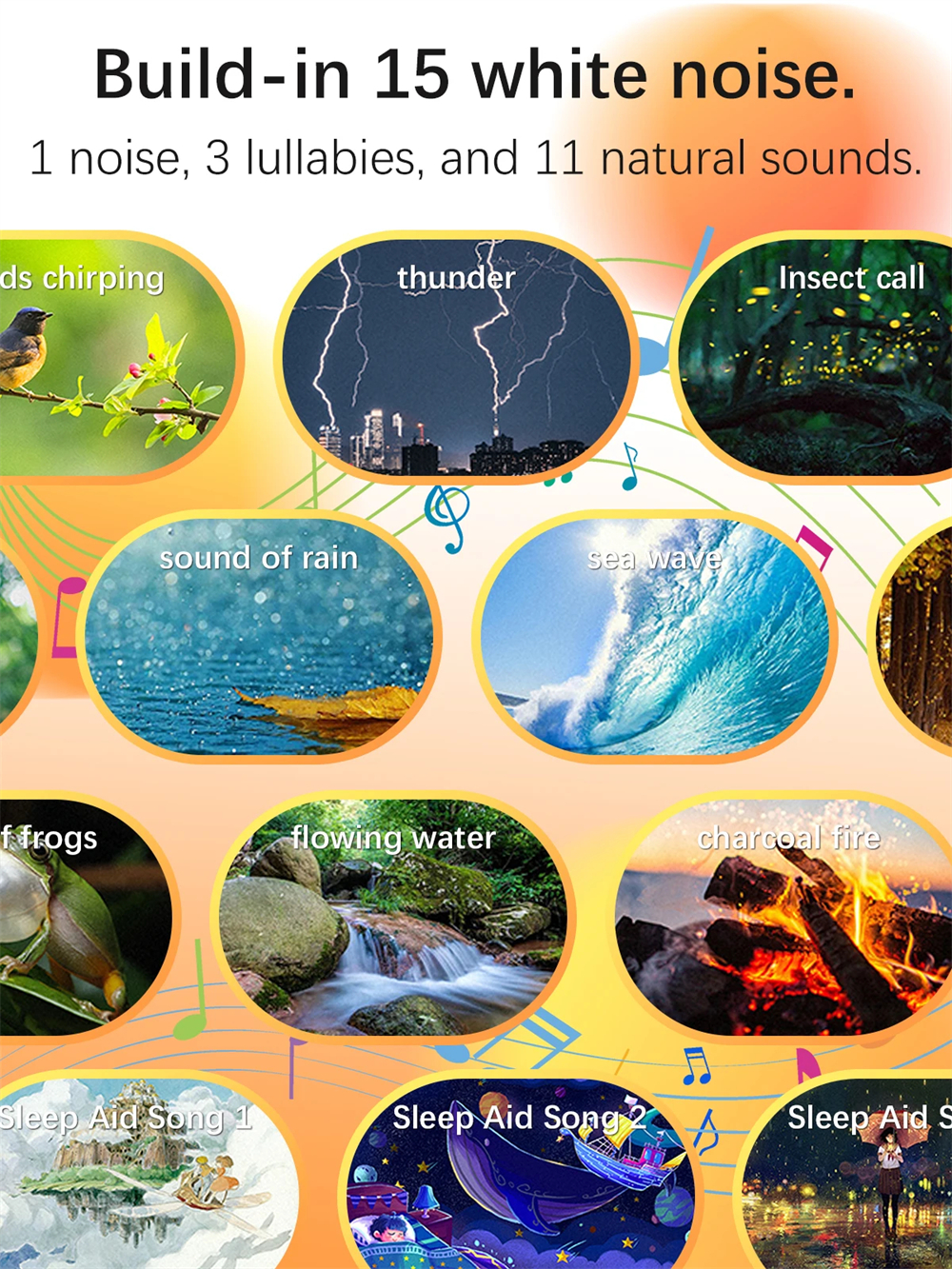 – Yövalotehosteet ja unta tukevat äänet: Valitse erilaisista valotiloista rauhoittavaa yövaloa varten. Mukana 1 valkoinen kohina, 3 unisävelmää ja 11 luonnonääntä levollista nukahtamista varten.