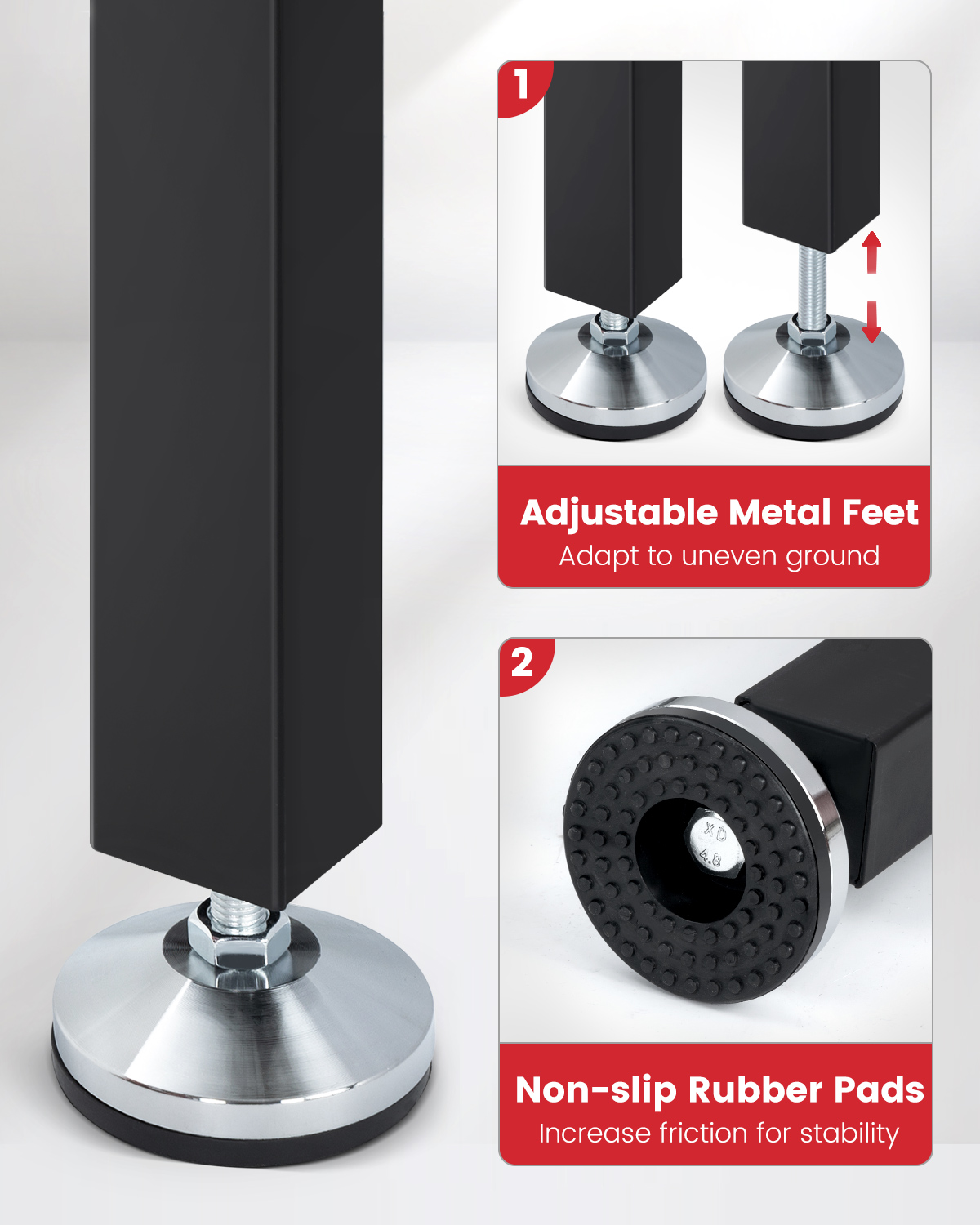 – Tukeva teräsrunko ja säätömahdollisuus jaloissa