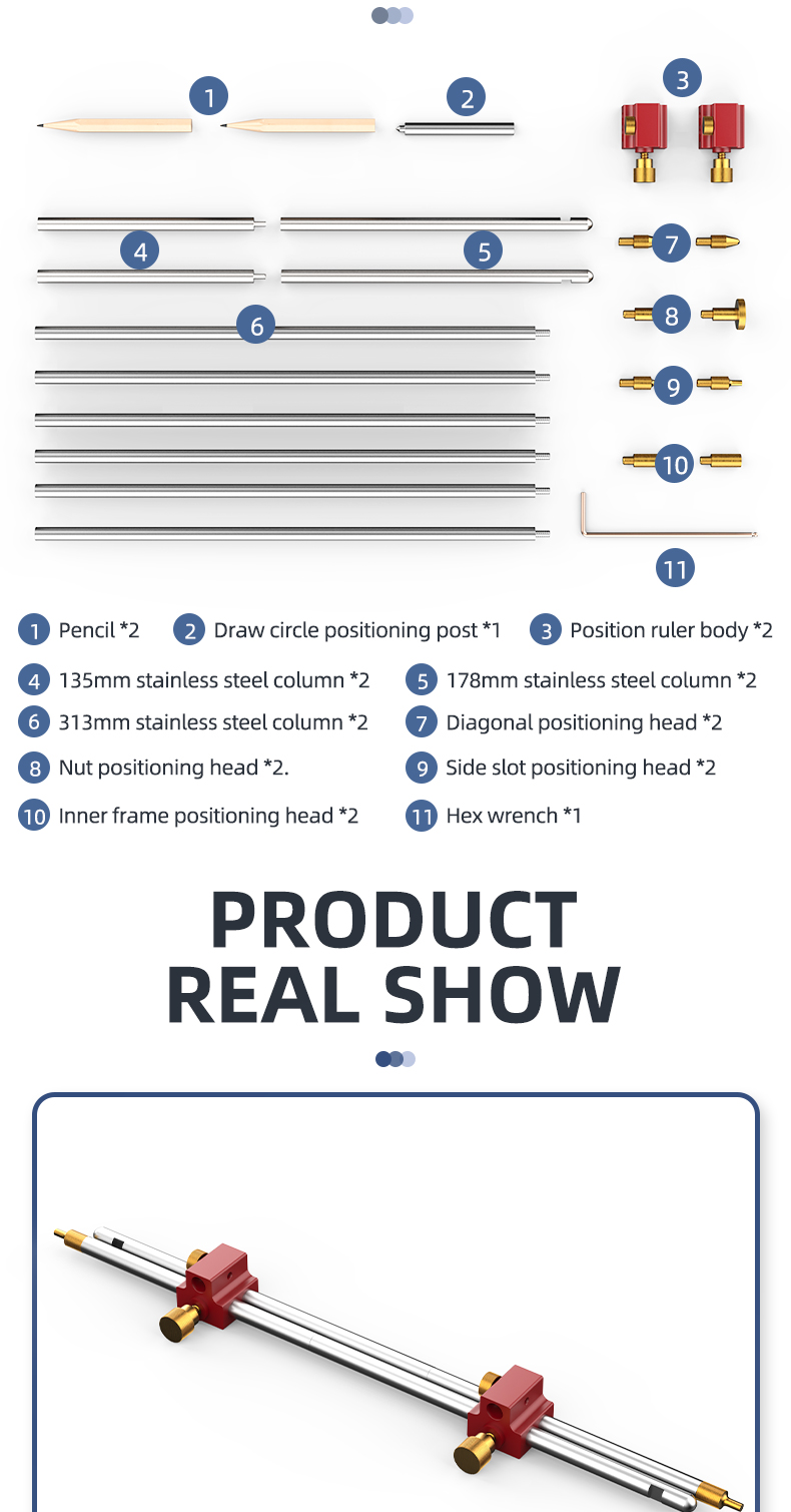 Monikäyttöinen käyttö: Perinteisen mittaamisen lisäksi tämä mittatanko toimii myös pyöreänä piirto-viivaimena. Ympyränpiirtotoiminto sopii tarkkojen ympyröiden ja kaarien piirtämiseen, mikä helpottaa tehtäviä, joissa tarvitaan ohjausta ja ympyräkuvioiden merkitsemistä. Monitoimisuus sujuvoittaa työskentelyä ja säästää aikaa.