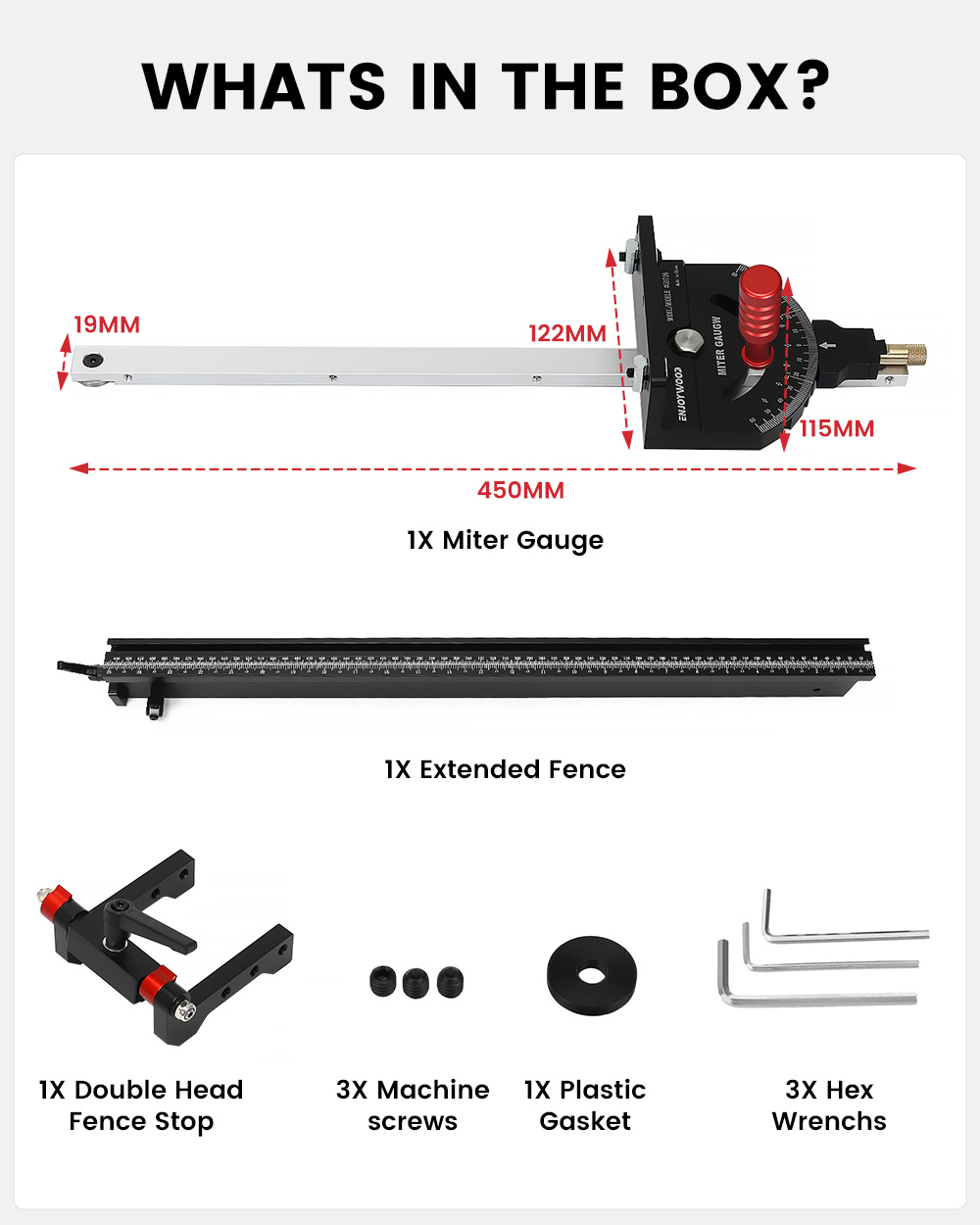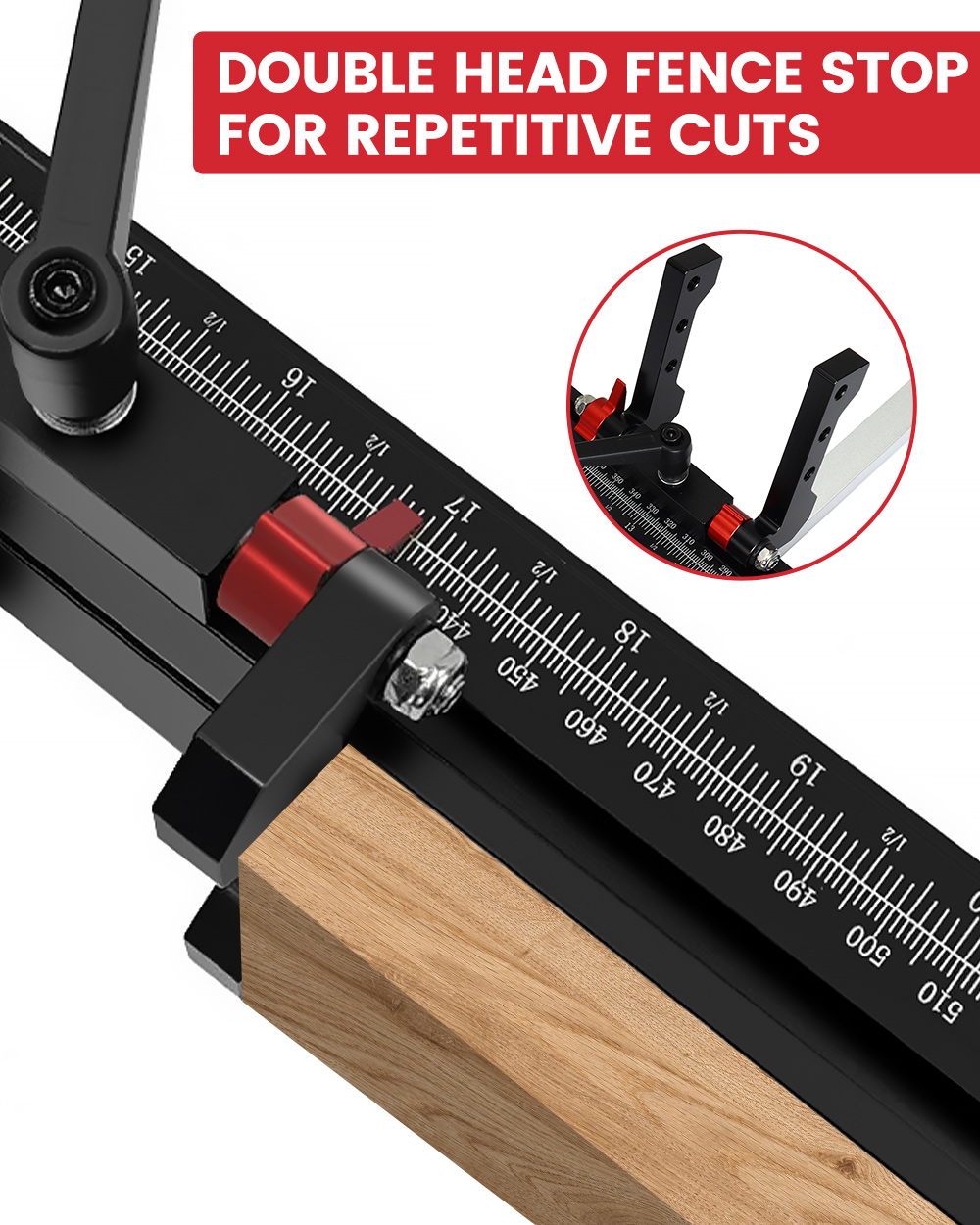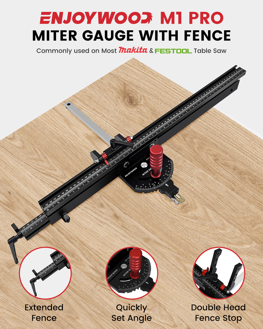 ENJOYWOOD M1 Pro on tarkka kulmaohjain (miter gauge) pöytäsahoille ja jyrsinpöydille, varustettuna pidennettävällä aidalla. Sen avulla voit asettaa sahauskulmat helposti ja toistettavasti 0–60 asteen välillä, mikä helpottaa sekä suorien että viiste- ja jiirisahausten tekemistä.