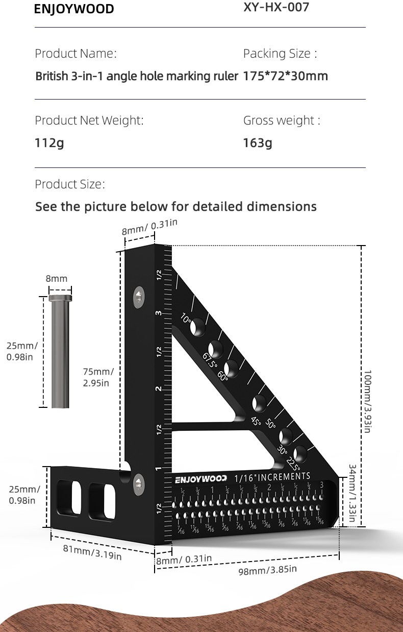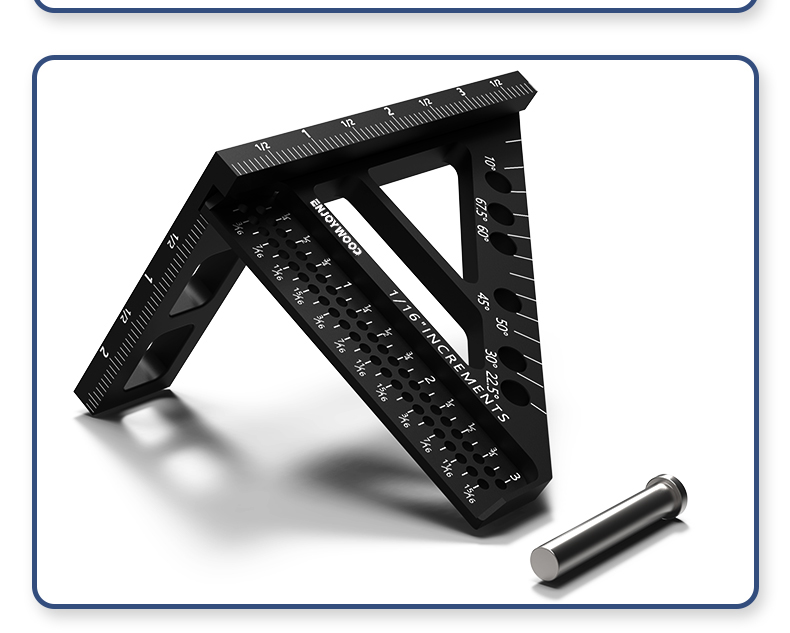 ENJOYWOOD monitoimikulmaviivain alumiini T-malli mitta ja merkintä tuuma ja millimetri kulmat 22.5/30/45/60/67.5/90 astetta
