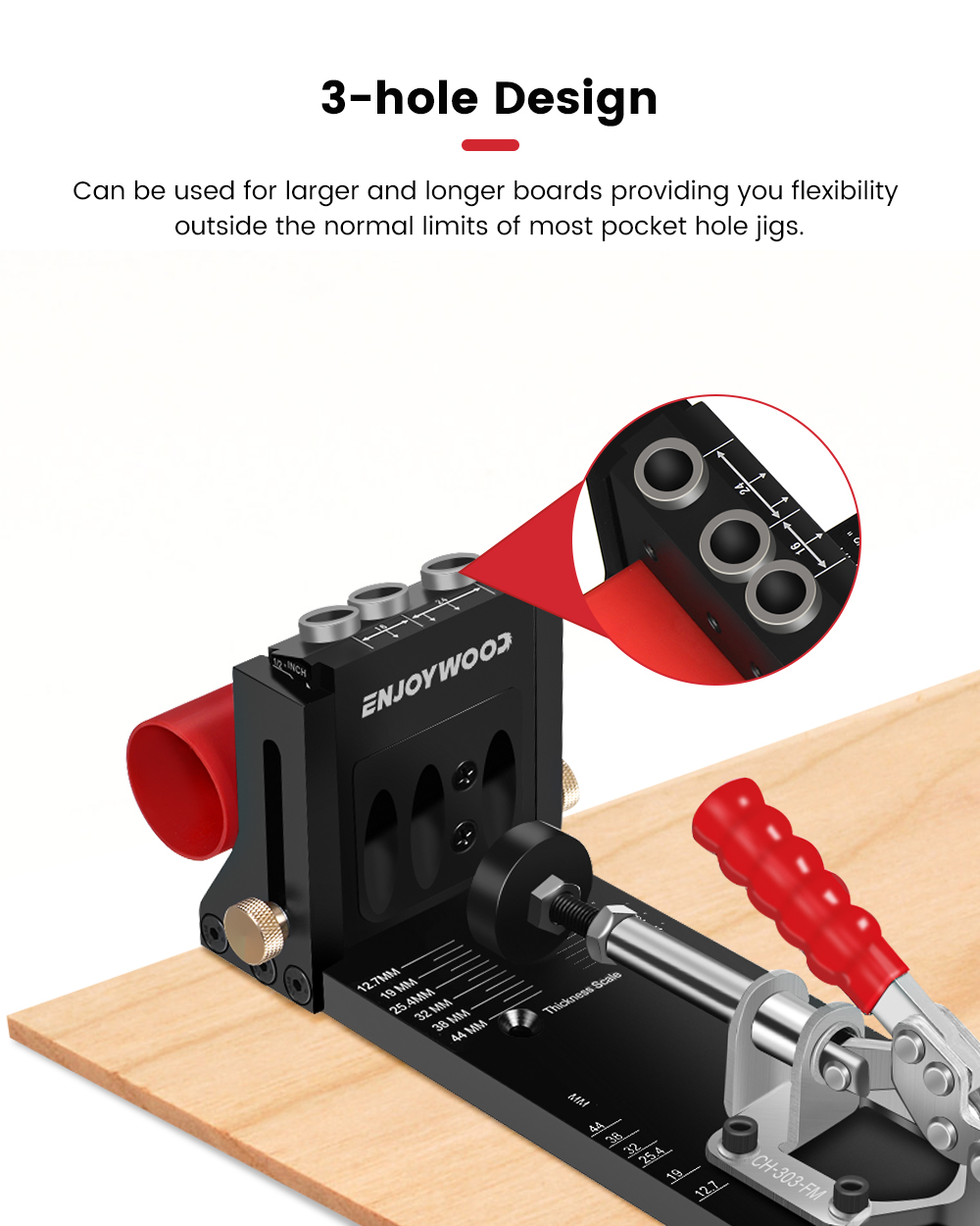 - 3-reikäinen rakenne – Soveltuu suuremmille ja pidemmille laudoille ja antaa enemmän joustavuutta kuin useimmat taskureikäsapluunat.