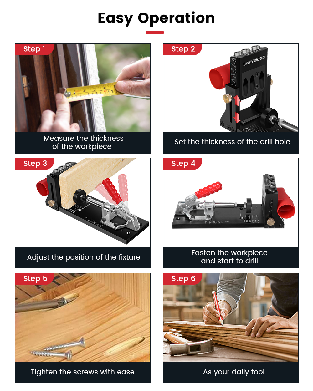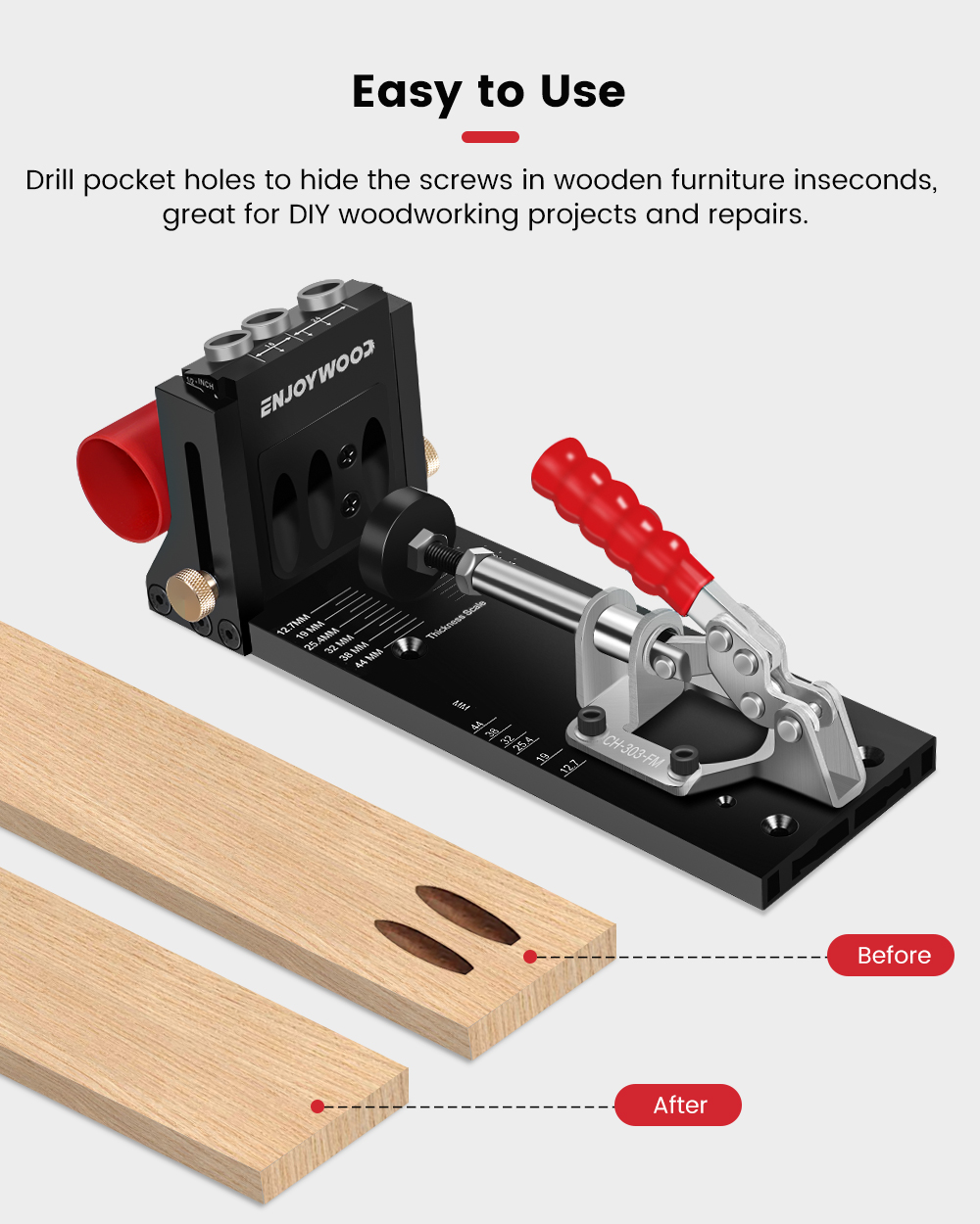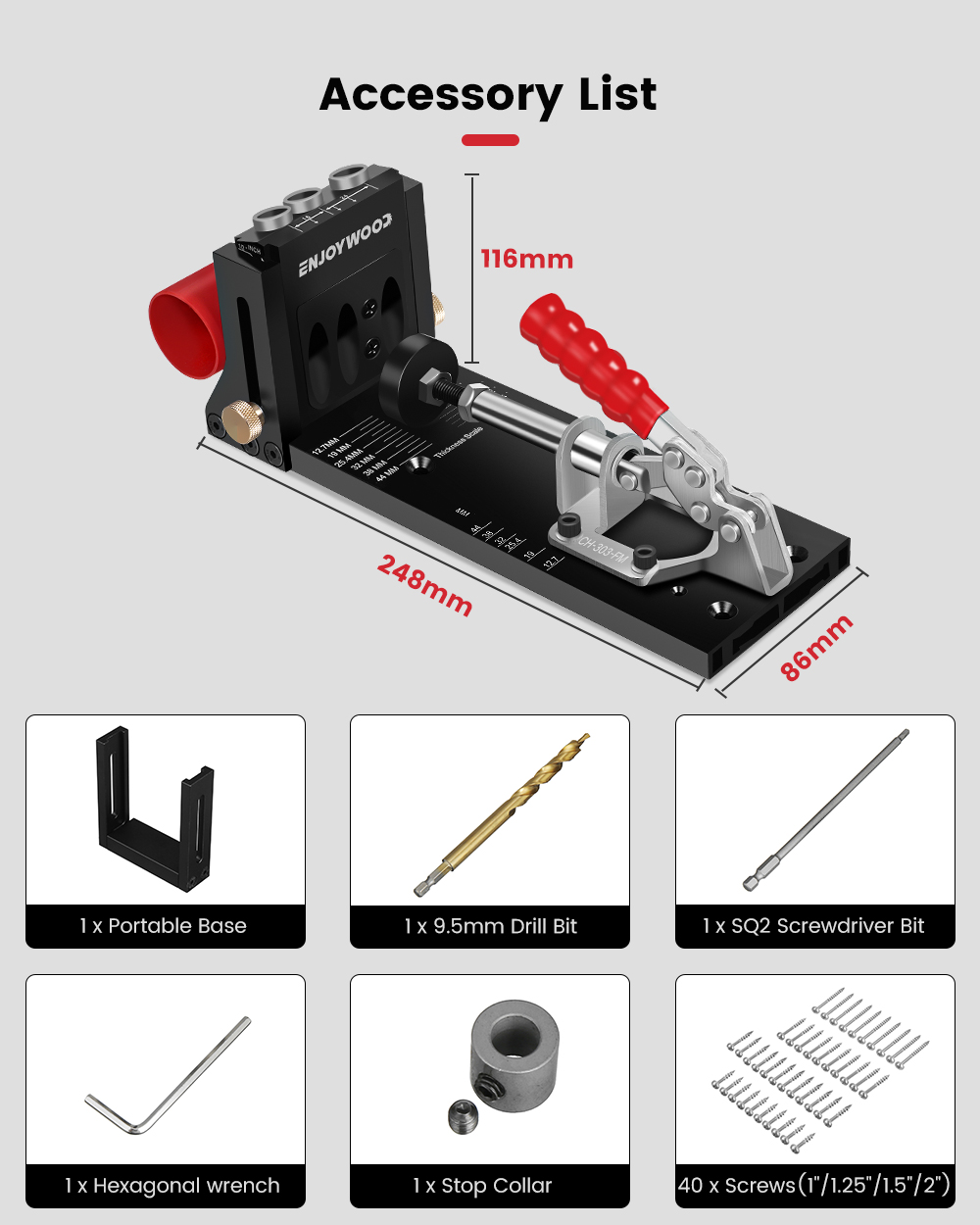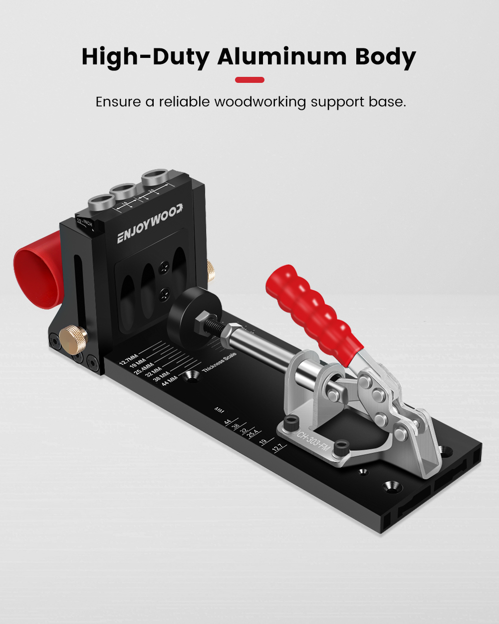 ENJOYWOOD XK4 Pocket Hole Jig Kit on alumiiniseoksesta valmistettu, säädettävä puutyöporajigi kulmareikiä varten. Soveltuu sekä tee se itse -projekteihin että ammattimaiseen huonekalujen valmistukseen ja korjaukseen.