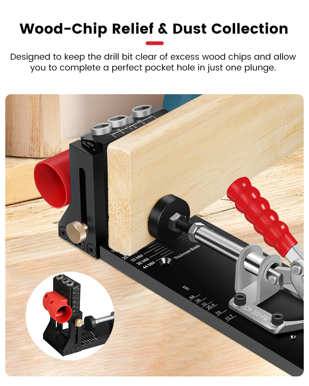 - Säädettävä korkeus – Kovetetussa poraohjainsarjassa on kaksi selkeää asteikkoa: tuumat ja millimetrit. Kaiverrukset pysyvät selkeinä eivätkä kulu pois pitkänkään käytön jälkeen. Irrotettavan liukusäätimen ansiosta porauskorkeuden säätäminen laudan paksuuden mukaan on vaivatonta.