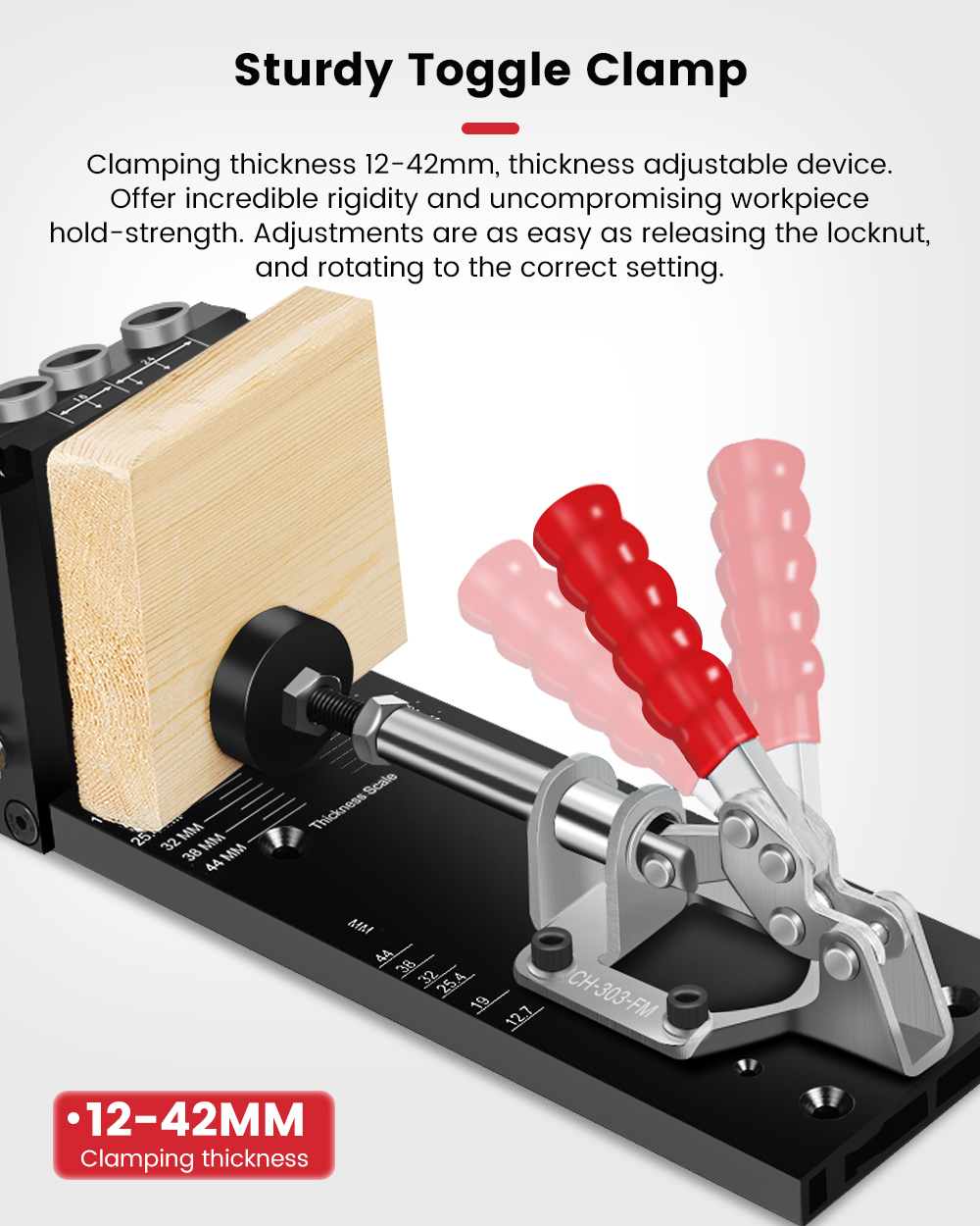 - Vankka vipupuristin – Puristuspaksuus 12-42mm, tarjoaa erittäin tukevan pidon työkappaleelle.