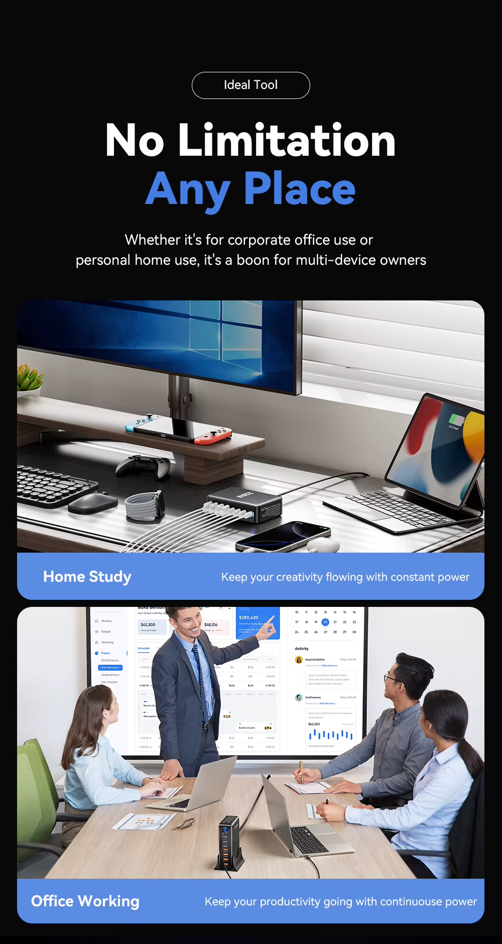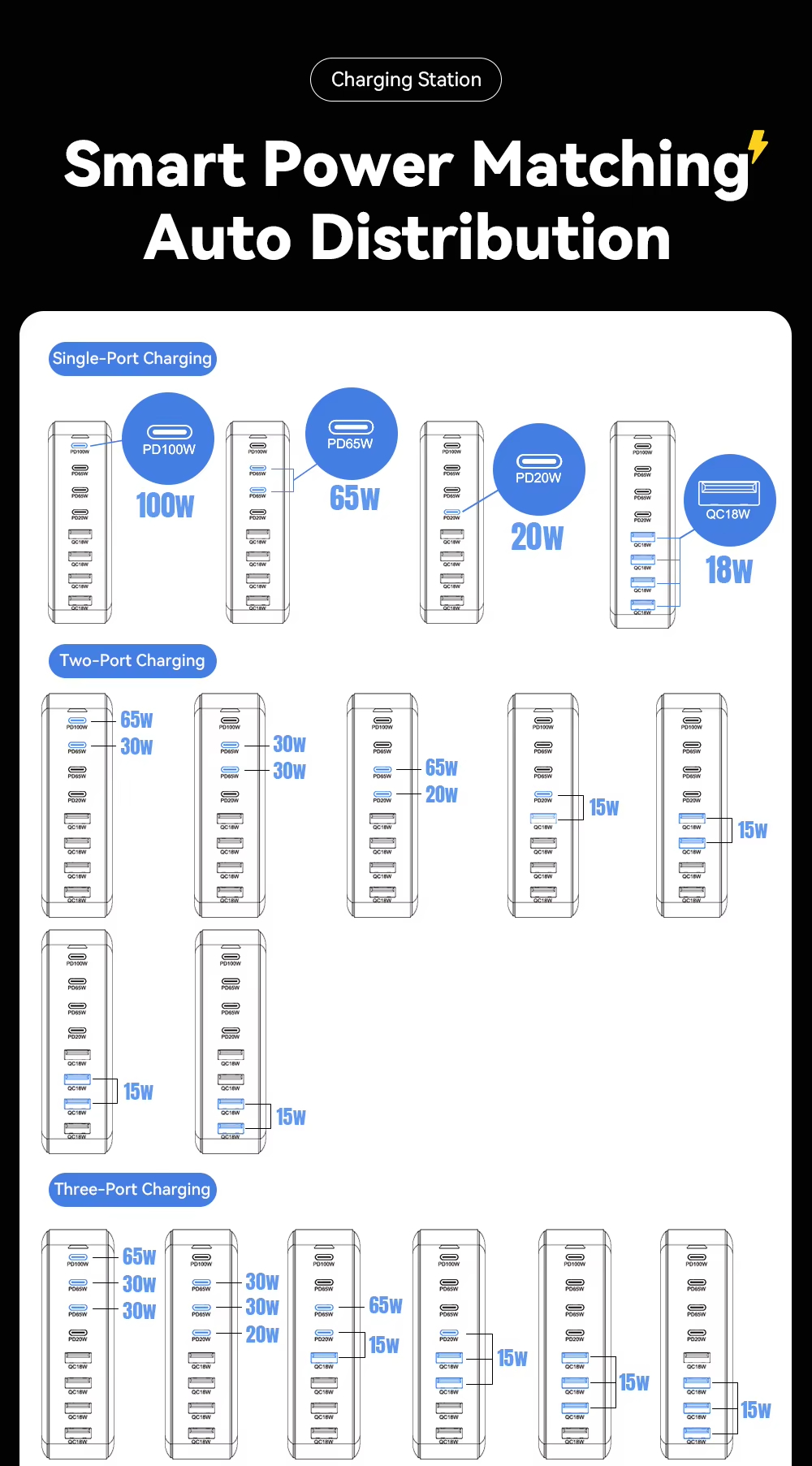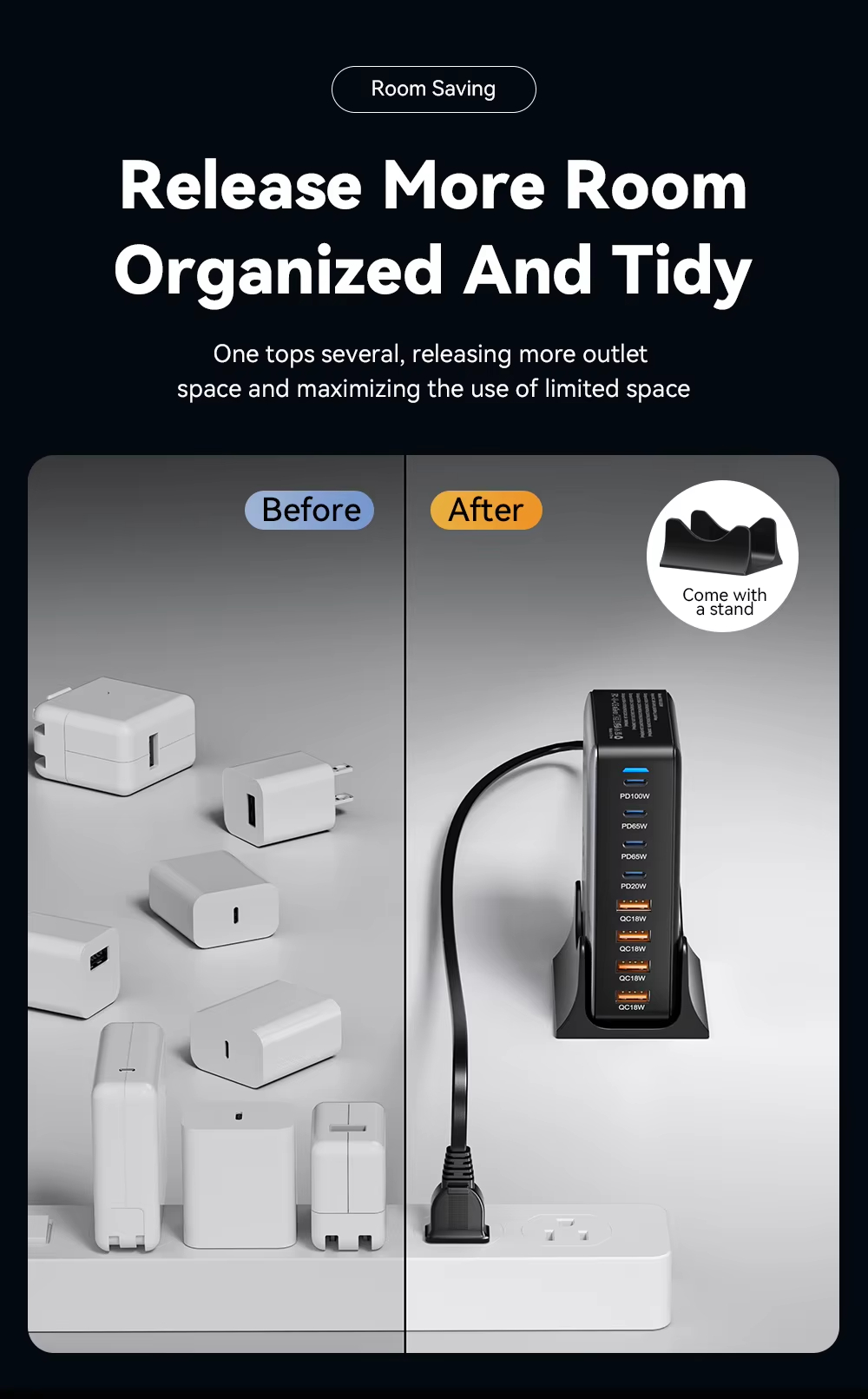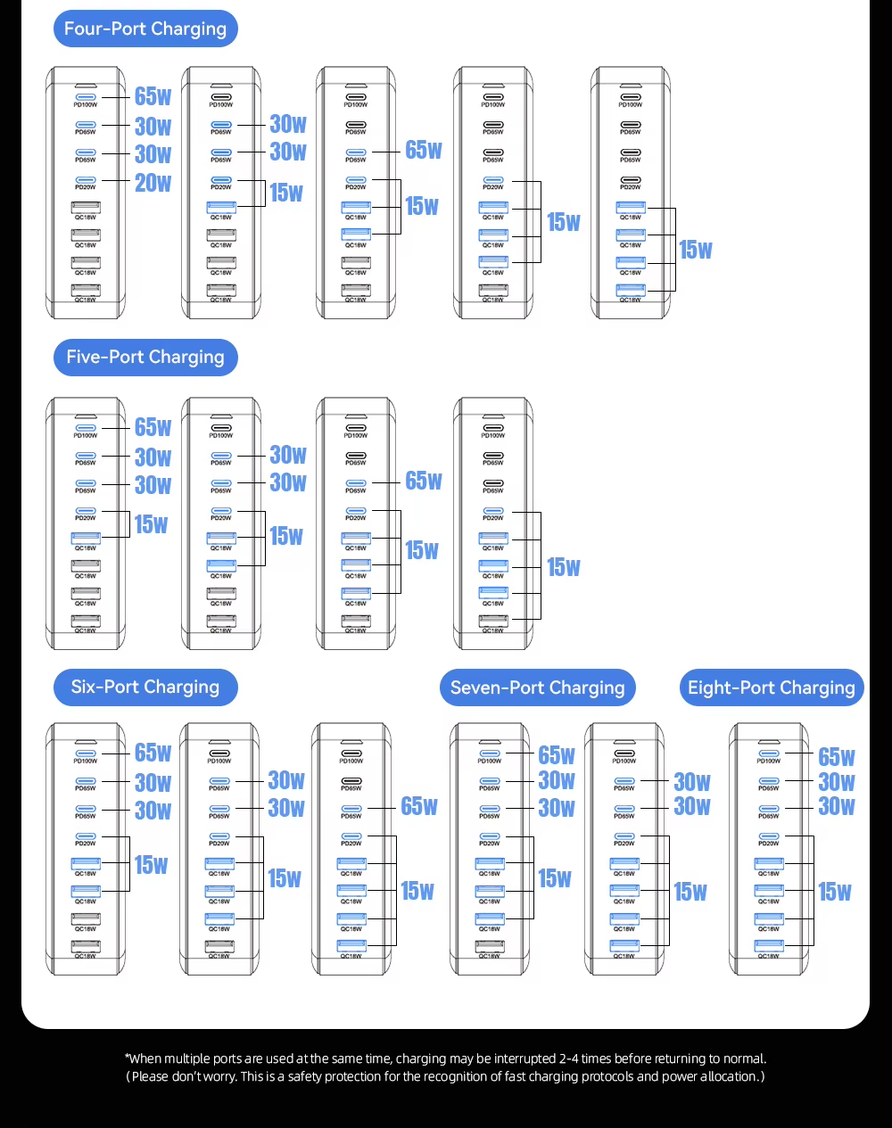 4. Moniporttirakenne: 8 porttia (4 USB-C ja 4 USB-A) jopa 8 laitteen samanaikaiseen lataukseen.