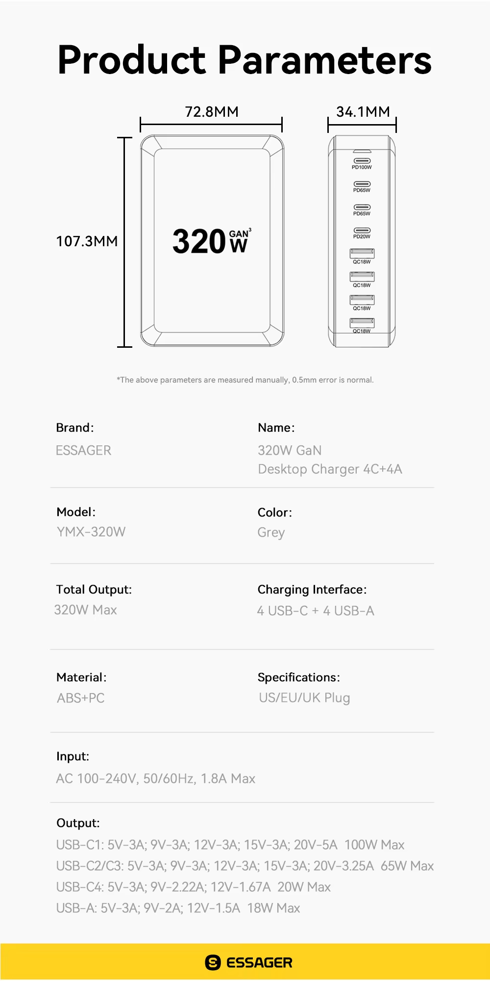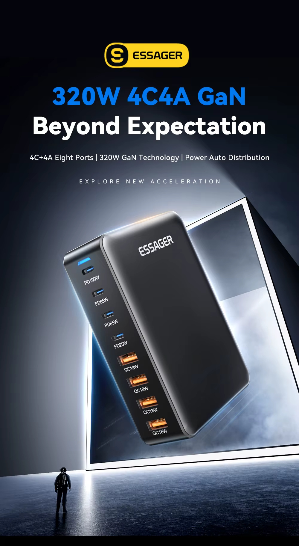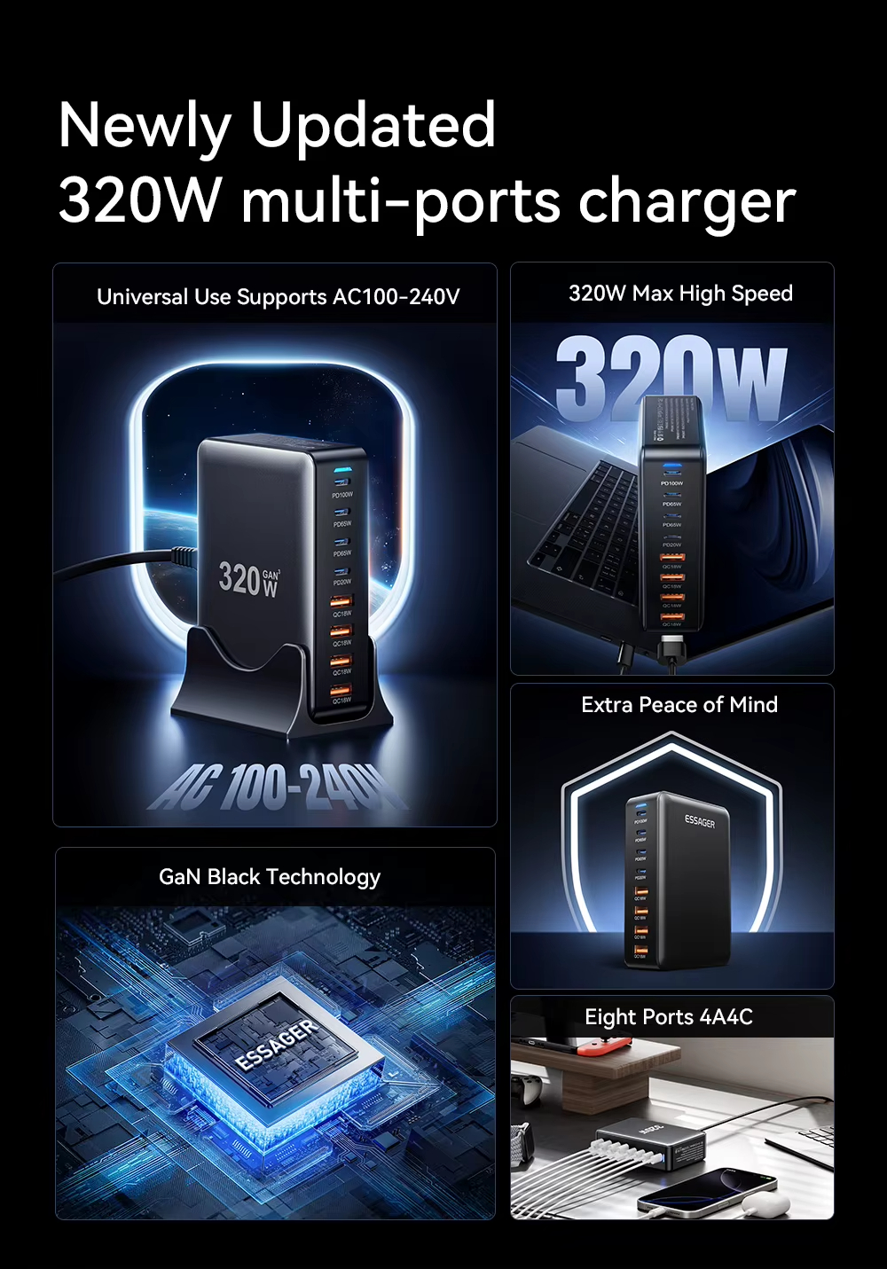 ESSAGER YMX-320W 320W GaN 8-porttinen pöytälaturi 4 USB-C-porttia 4 USB-A-porttia