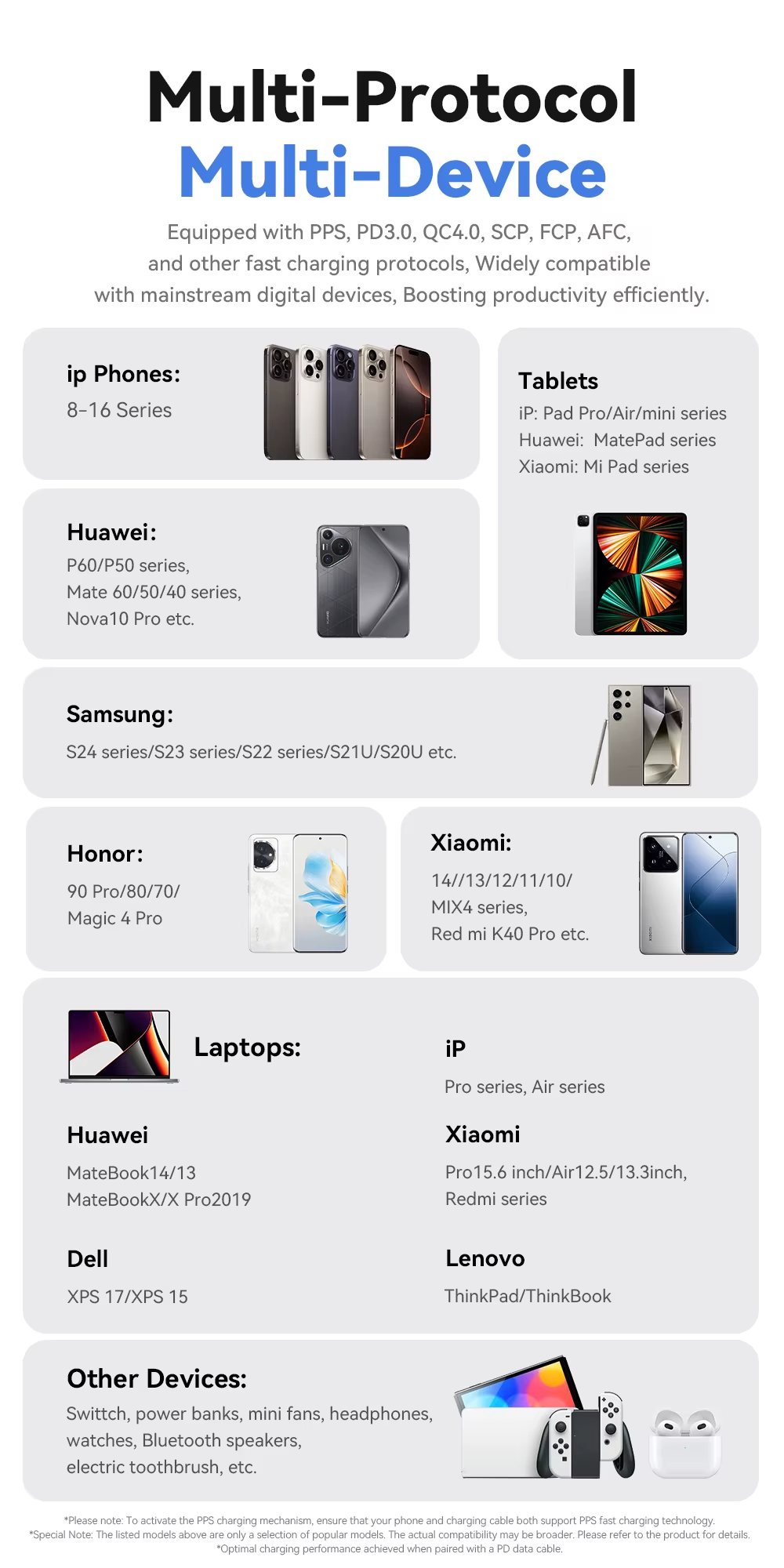 6. Laaja yhteensopivuus: tukee pikalatausprotokollia PPS, PD3.0, QC4.0, SCP, FCP, AFC – yhteensopiva älypuhelimien, tablettien, kannettavien tietokoneiden ja muiden laitteiden kanssa.