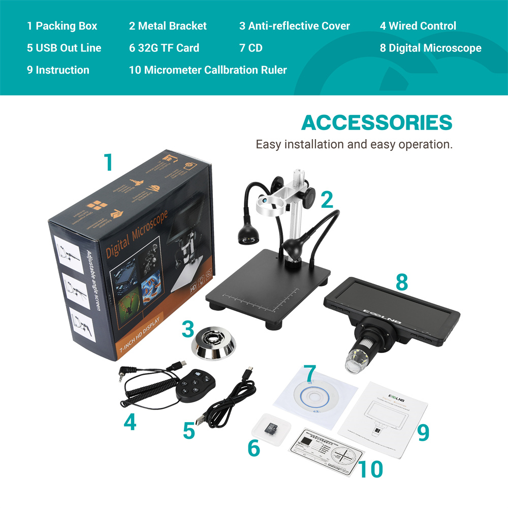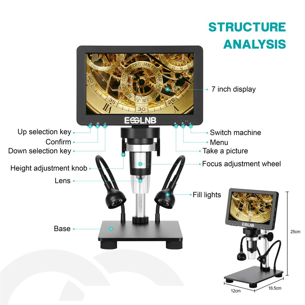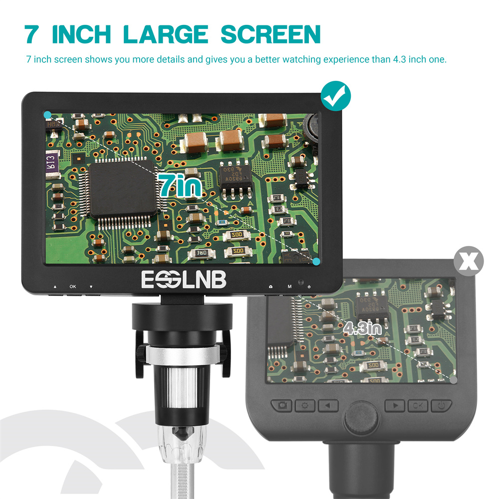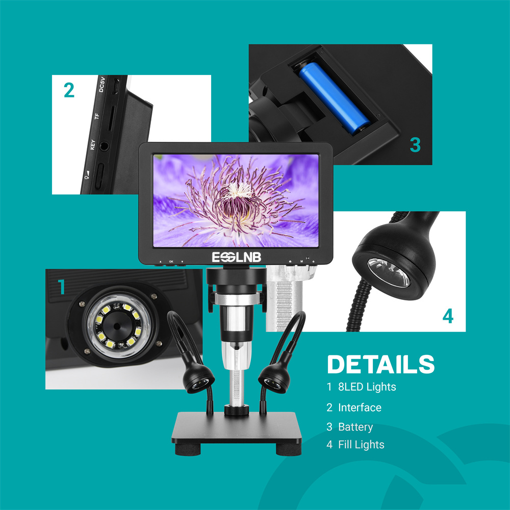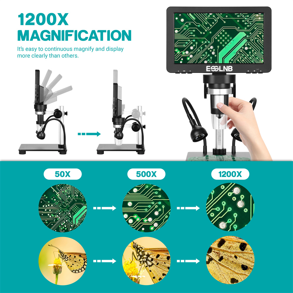 Tämä ESSLNB-merkin malli ES1051 on 1080P-videotarkkuudella varustettu digitaalinen mikroskooppi, jossa on 7-tuumainen näyttö ja metallinen runko. Se soveltuu hyvin esimerkiksi elektroniikan juotosten tarkasteluun, kolikkojen ja korujen tutkimiseen, opetuskäyttöön sekä harrastuksiin, joissa tarvitaan suurta suurennosta ja selkeää kuvaa.