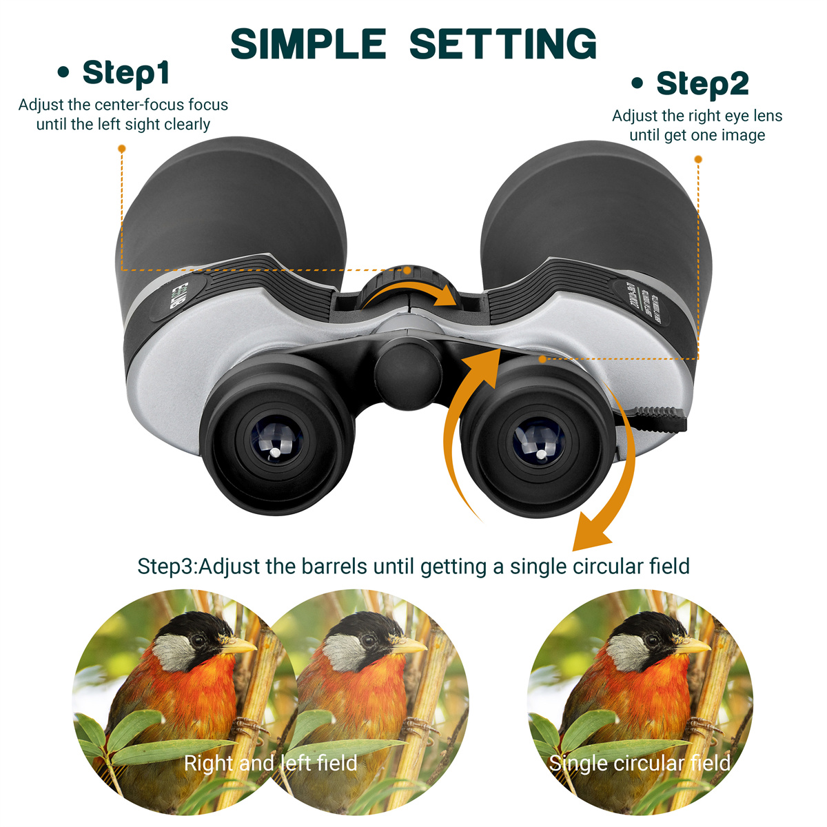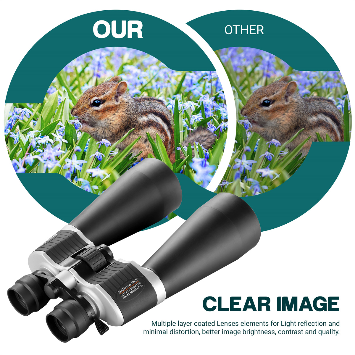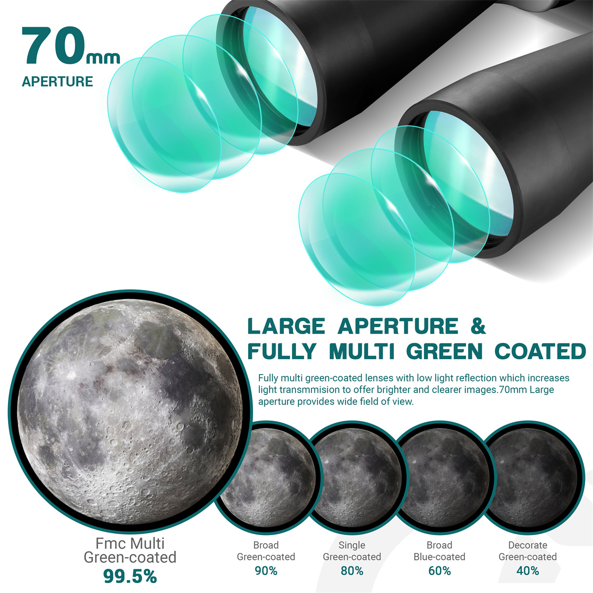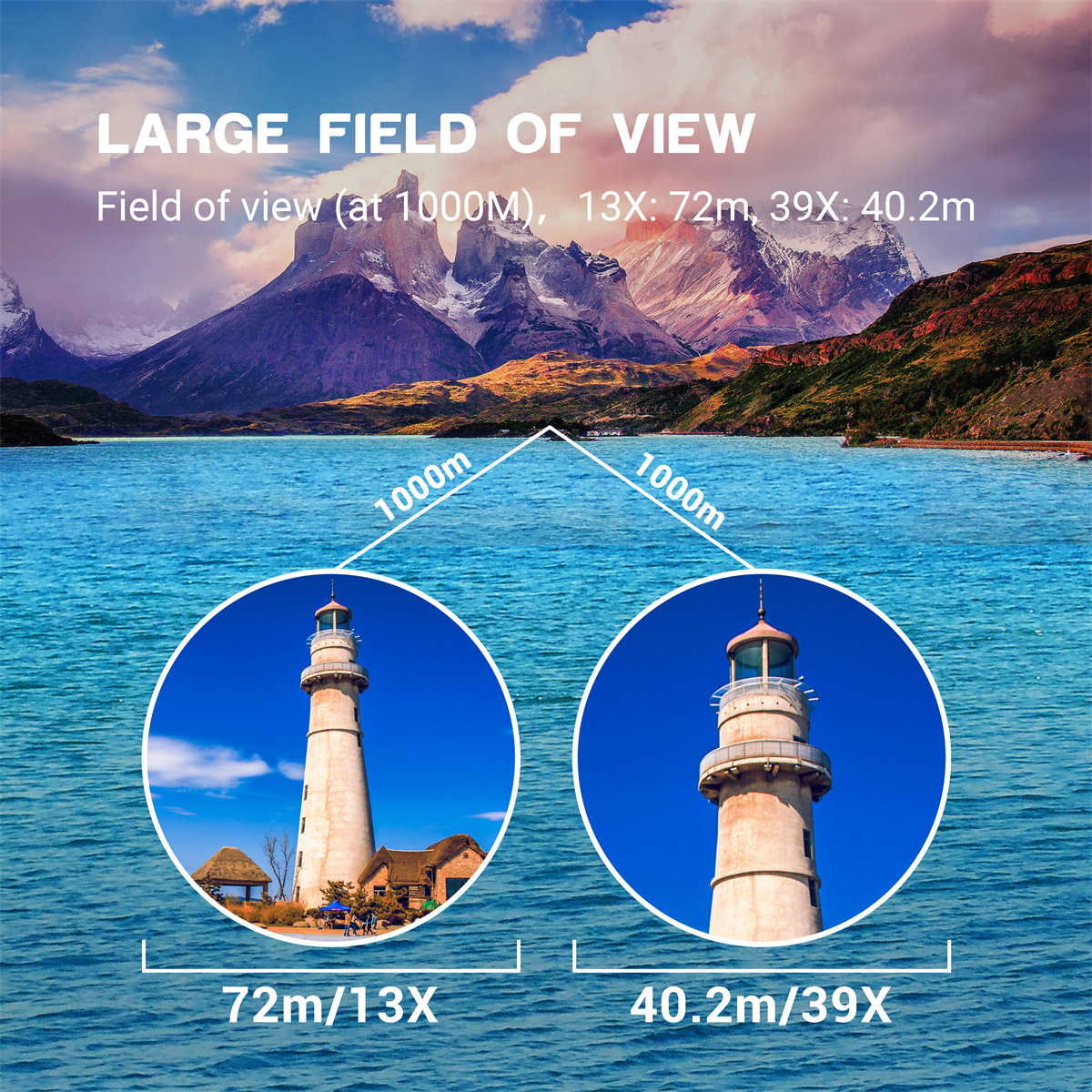 1. Suurikokoiset kiikarit: 13-39X zoom-suurennos ja 70 mm täysin monikerrospinnoitettu objektiivilinssi tarjoavat hyvän kirkkauden ja korkean kontrastin kuvat hämärässä ja pitkän matkan katselussa. Pinnoitteet vähentävät värivirheitä ja vääristymiä.