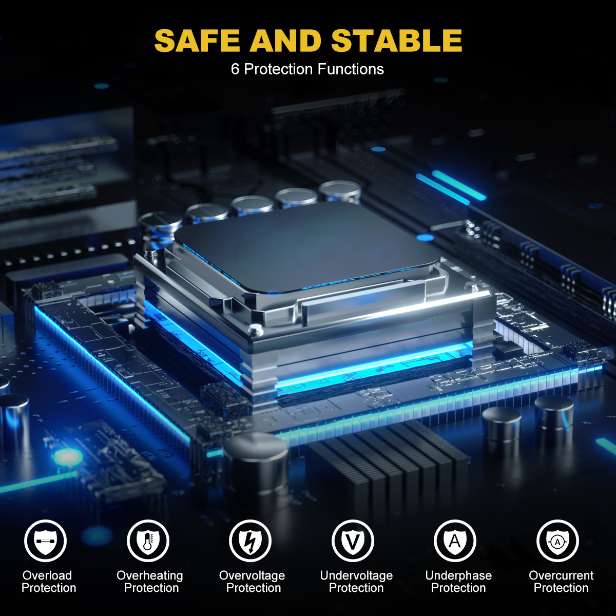 • Laaja suojaus: ylivirta, ylijännite, alijännite, ylikuumeneminen, vaiheen katkeaminen, ylikuormitus