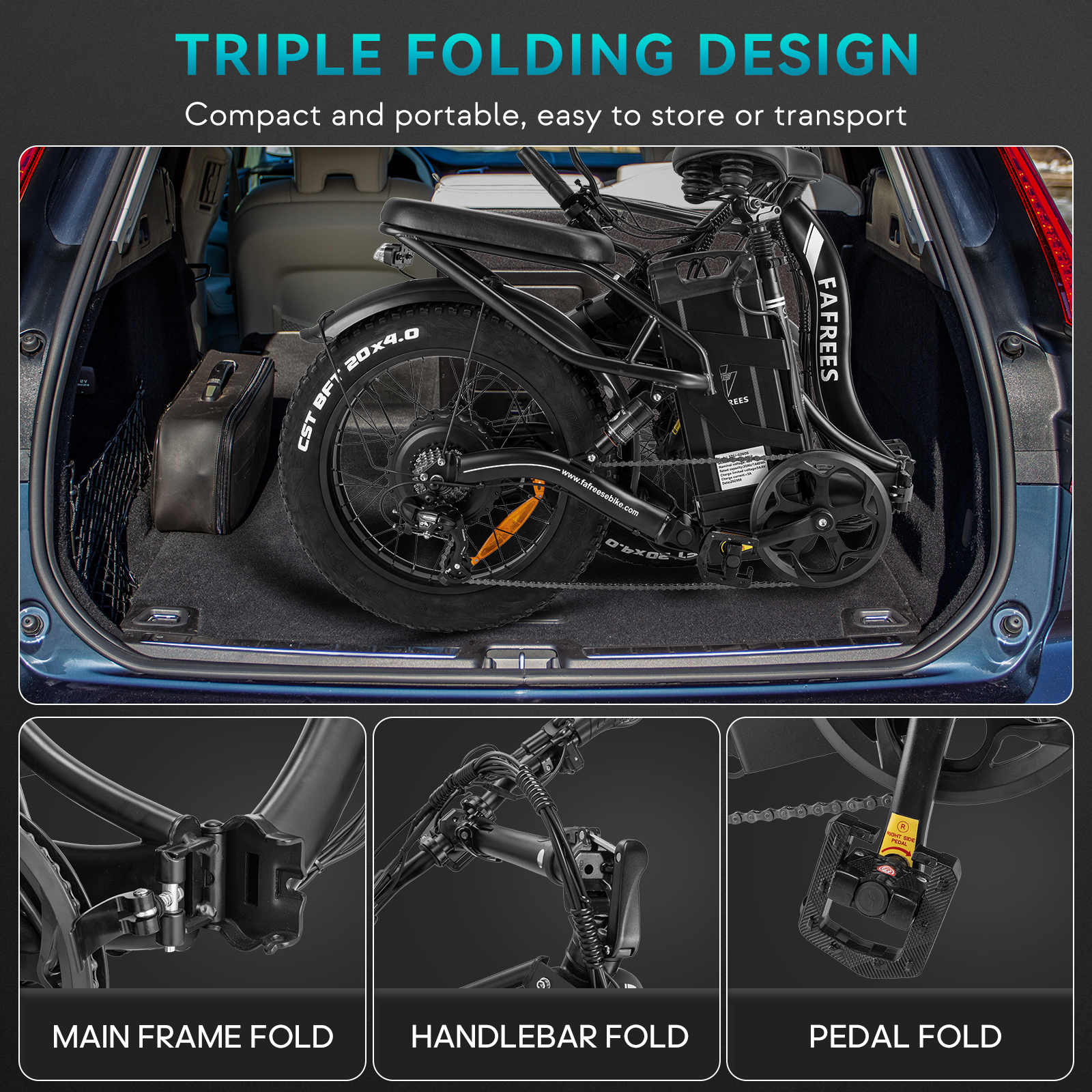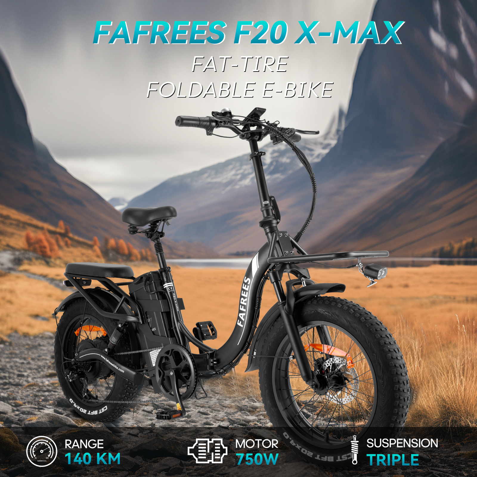 FAFREES F20 X-MAX on kokoontaitettava, pitkätoimintamatkainen sähköpyörä, jossa yhdistyvät tehokas 750W moottori, suuri 48V 30Ah akku ja mukava jousitus sekä edessä että takana. Leveät 20*4.0-tuumaiset renkaat ja hydrauliset levyjarrut tekevät ajosta vakaata sekä kaupungissa että sorateillä.