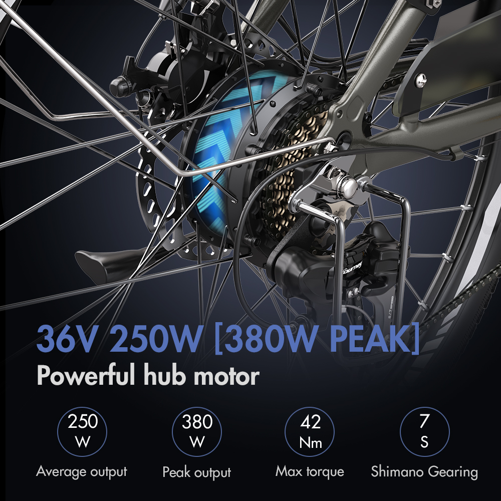 - 36V 250W takamoottori, huipputeho 380W ja maksimi vääntömomentti 42N.m