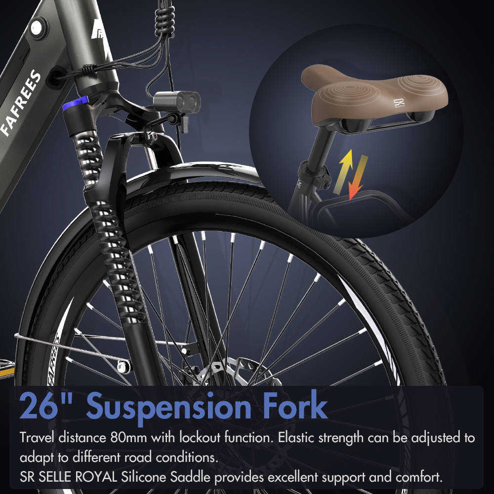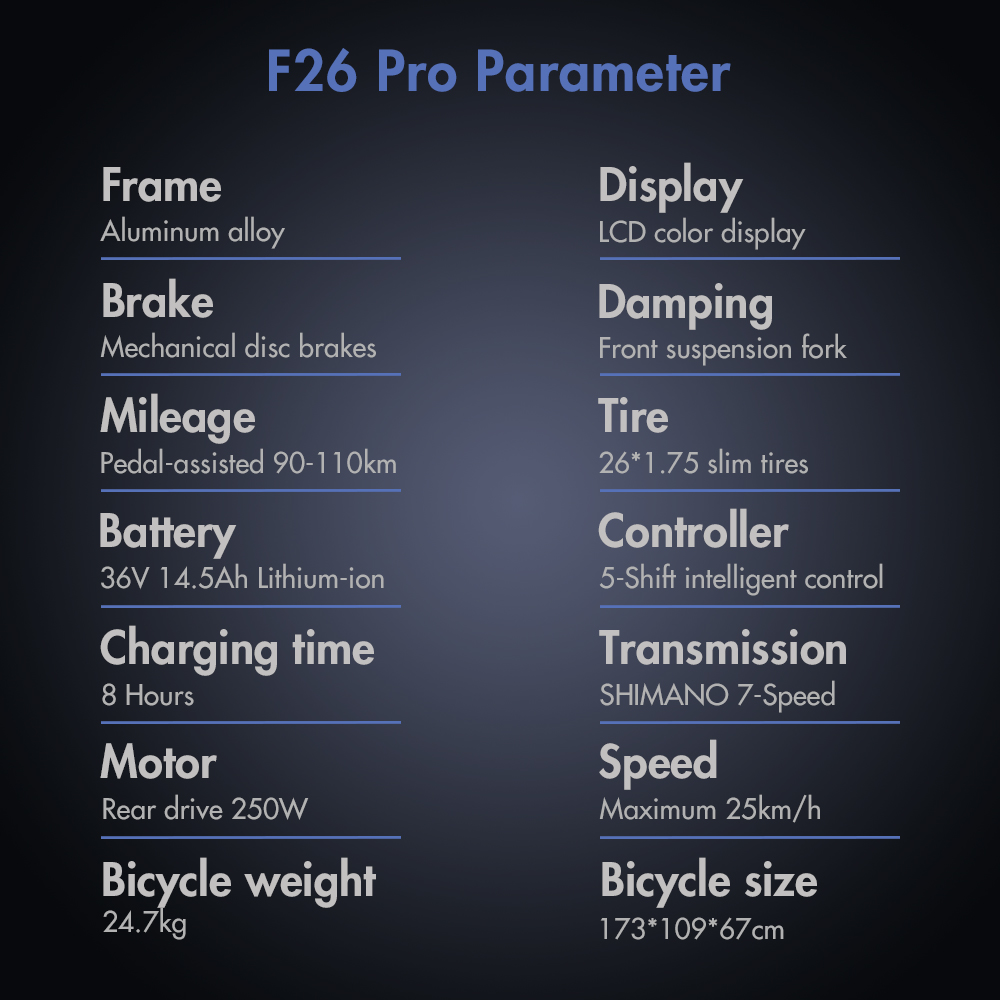 FAFREES F26 Pro on monipuolinen sähköpyörä arjen ajoon ja vapaa-aikaan. Kestävä alumiinirunko, jousitettu etuhaarukka ja 26-tuumaiset ilmakumit tekevät ajosta miellyttävää sekä kaupungissa että sorateillä. 36V 250W taka‑moottori ja 36V 14.5Ah litiumioniakku tarjoavat jopa 90–110KM toimintamatkan avustustilassa, joten työmatkat ja pidemmätkin retket sujuvat ilman lataushuolia.
