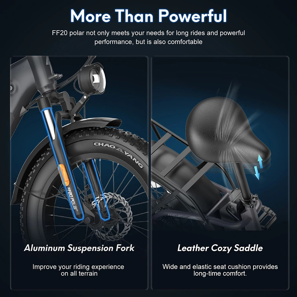 FAFREES FF20 Polar on tehokas ja monikäyttöinen sähköpyörä, jossa on 20*4.0-tuuman leveät renkaat ja kaksoisakut pitkää toimintamatkaa varten. Kestävä alumiinirunko, jousitettu etuhaarukka ja mekaaniset levyjarrut tuovat ajomukavuutta ja hallittavuutta niin kaupungissa kuin hiekkateillä.