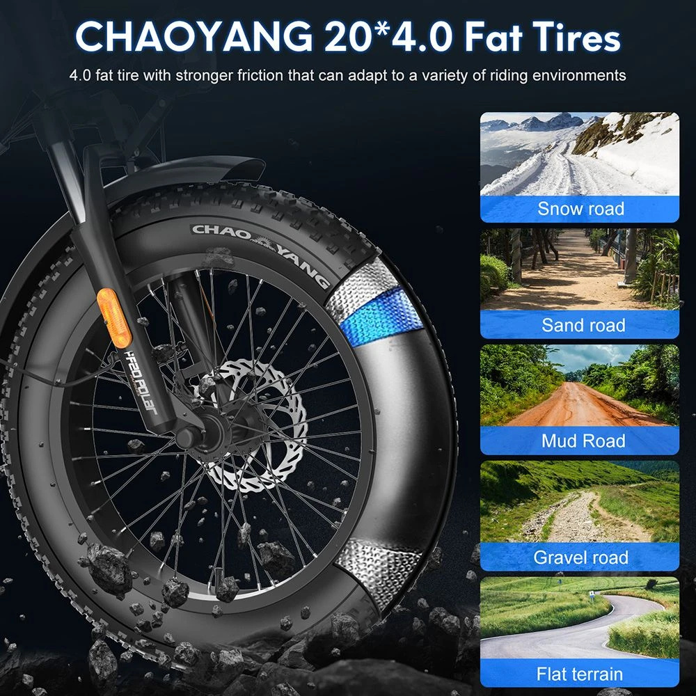 - 20*4.0-tuuman leveät renkaat vakauttavat ajoa erilaisilla alustoilla