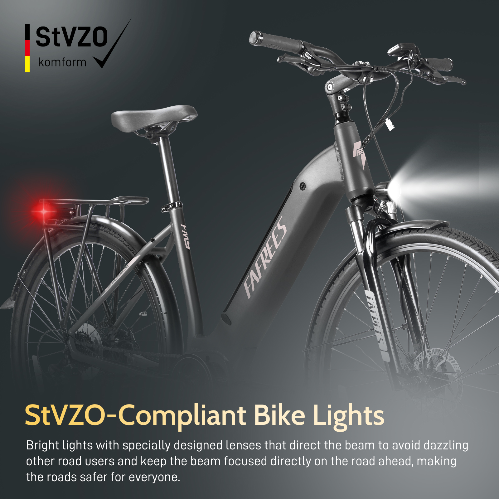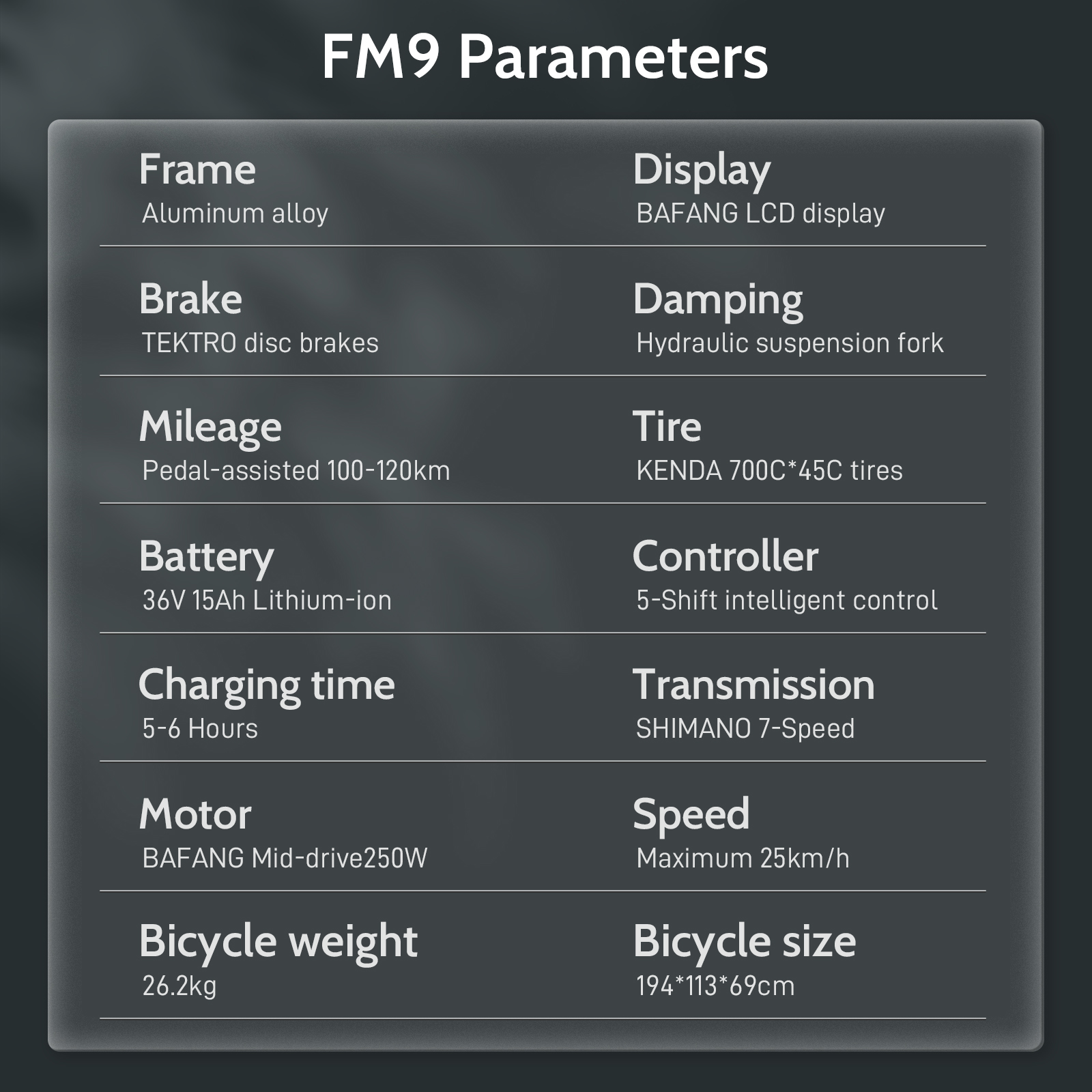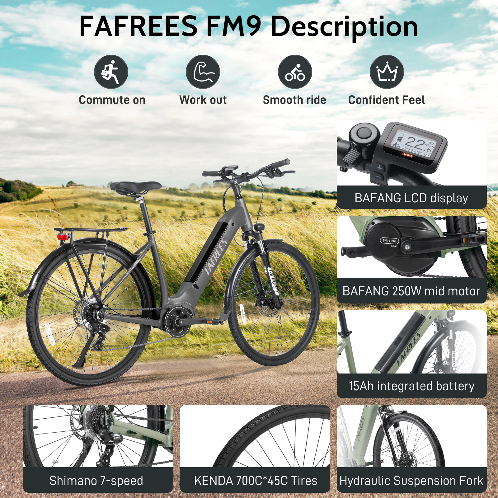 FAFREES FM9 on monipuolinen alumiinirunkoinen sähköpyörä, jossa yhdistyvät miellyttävä ajoasento, keskiöön sijoitettu BAFANG-moottori ja vääntömomenttia mittaava avustustunnistin. Pitkä toimintasäde, hydraulinen joustohaarukka ja mekaaniset levyjarrut tekevät pyörästä sopivan sekä päivittäiseen kaupunkiajoon että pidemmille retkille.