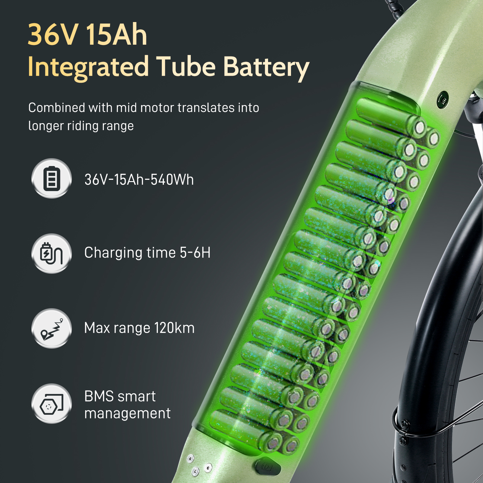- 36V 15Ah/540Wh litiumioniakku, toimintasäde avustustilassa noin 100–120KM