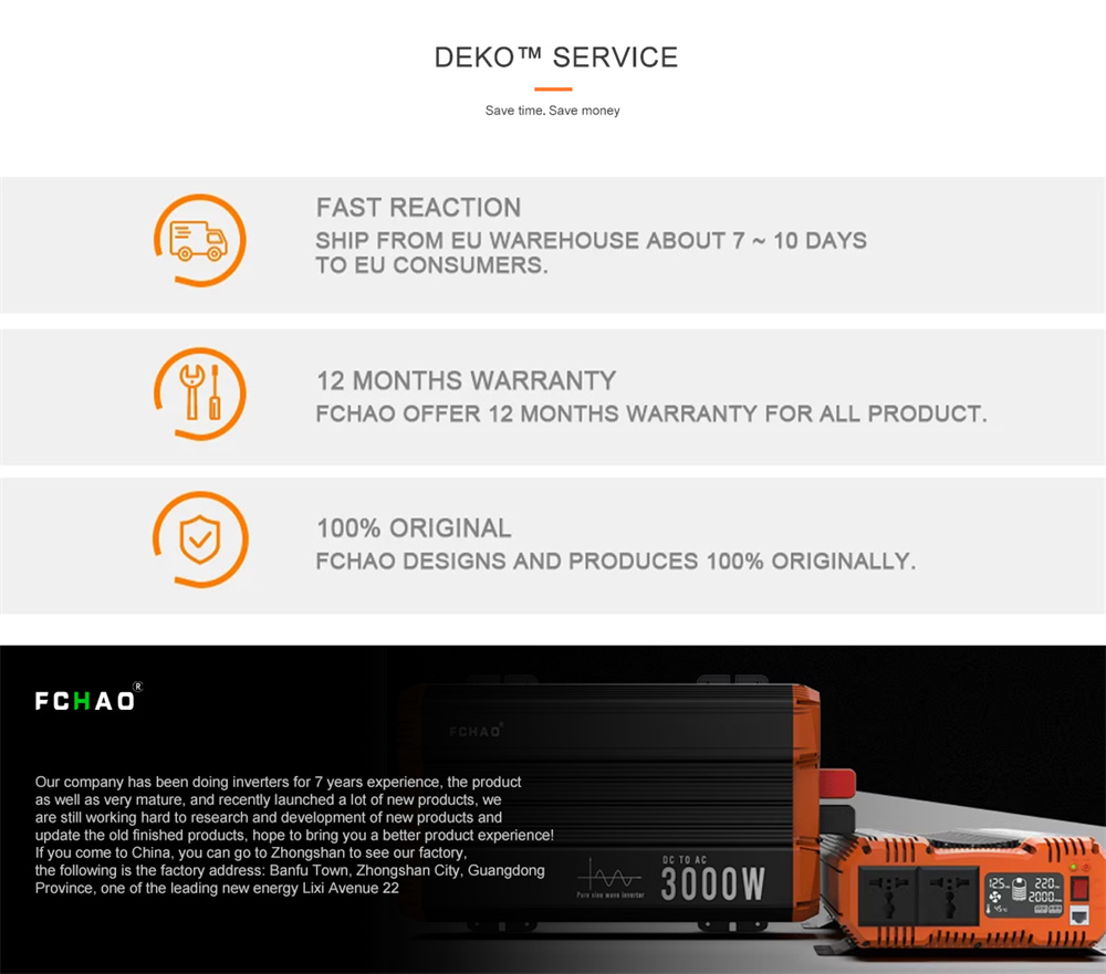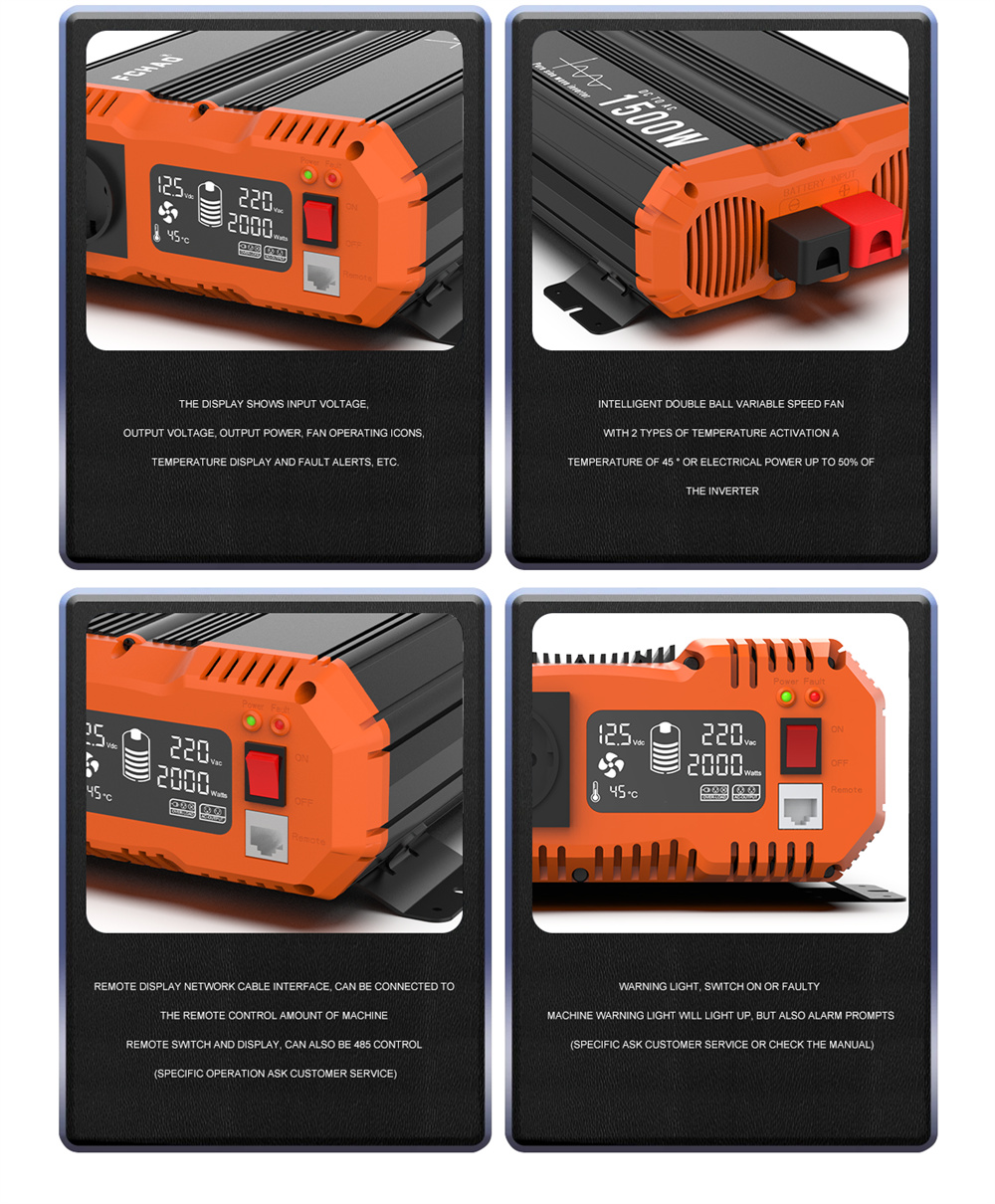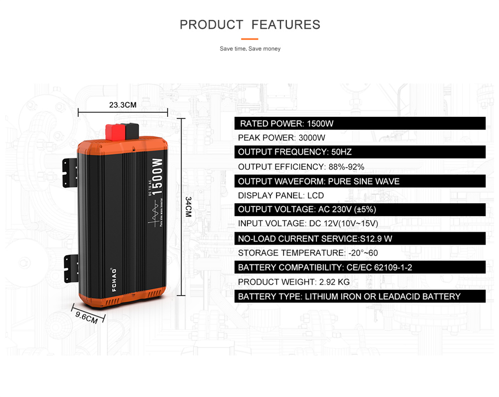 Tämä FCHAO PST-1500W puhdas siniaalto -invertteri muuntaa DC12V-tasajännitteen vakaaksi AC 230V -jännitteeksi. Se soveltuu esimerkiksi aurinkosähköjärjestelmiin, varavirtaratkaisuihin sekä vapaa-ajan käyttöön, kun tarvitaan verkkojännitettä muistuttavaa sähköä herkillekin laitteille.