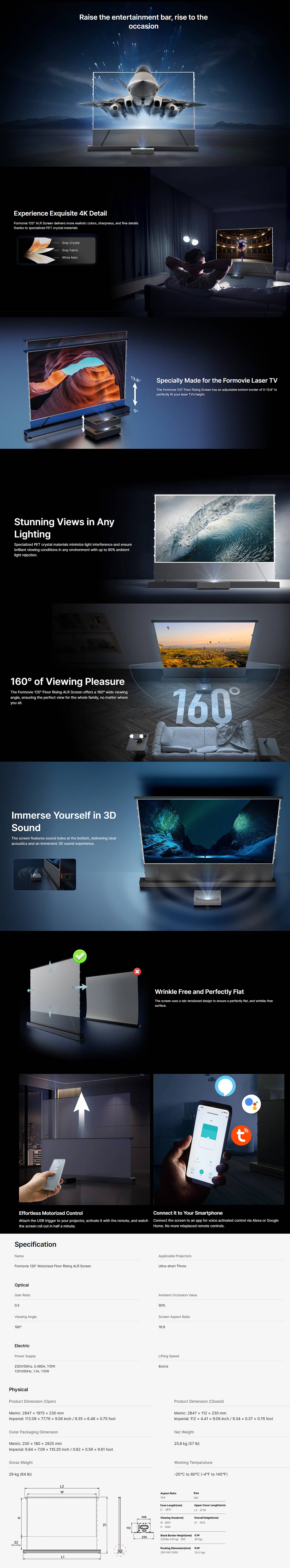 Formovie 120' Motorized Floor Rising ALR Screen -lattialta nouseva valkokangas tarjoaa vaivattoman käyttöönoton, hyvän näkyvyyden kirkkaissakin oloissa ja leveän katselukulman koko perheelle.