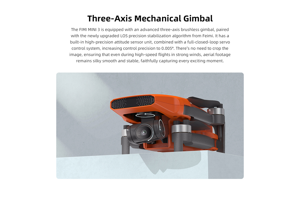- Kolmiakselinen mekaaninen gimbaali vakauttaa kuvan myös tuulisissa oloissa.