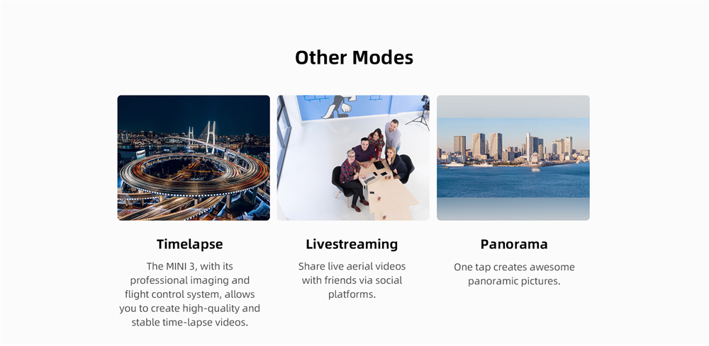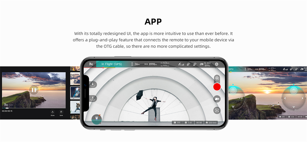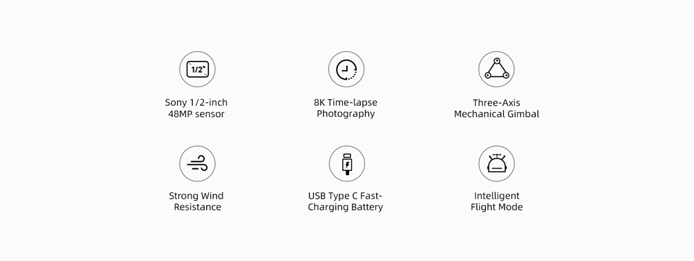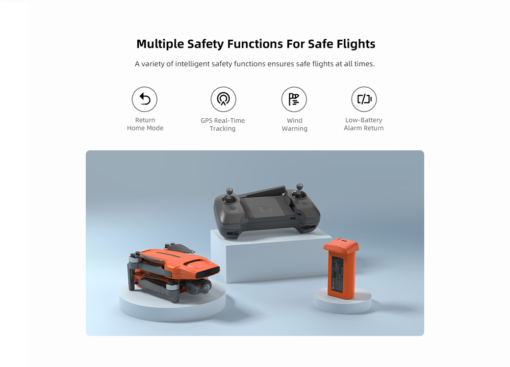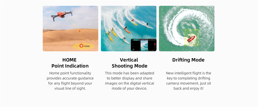 Toiminnot: 9KM kantama, 3-akselinen gimbaali, 32 minuutin lentoaika, alle 250g painoluokan kevyt rakenne, älykkäät seurantatilat, yhdellä napilla käynnistettävä video, yökuvaus, tehokas reittilentokuvaus, yövideo.