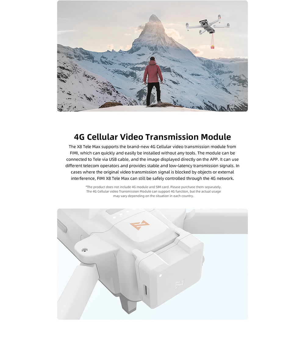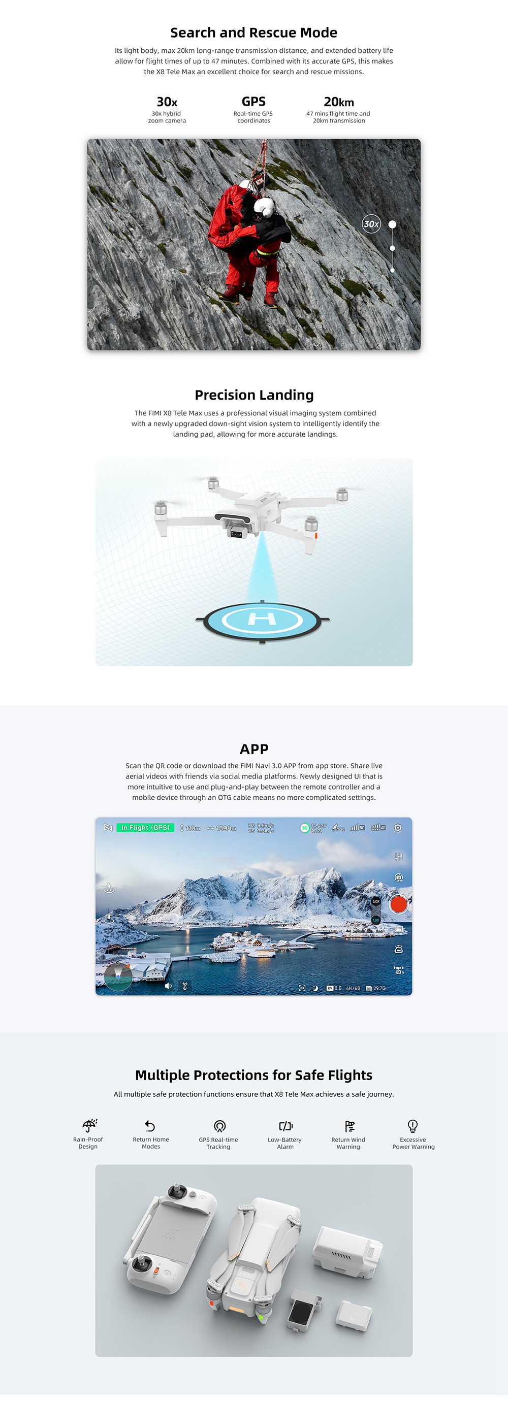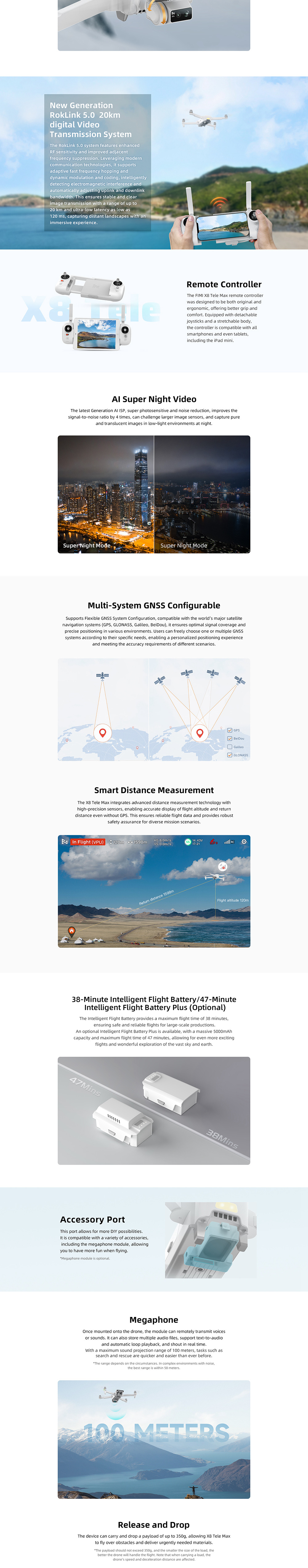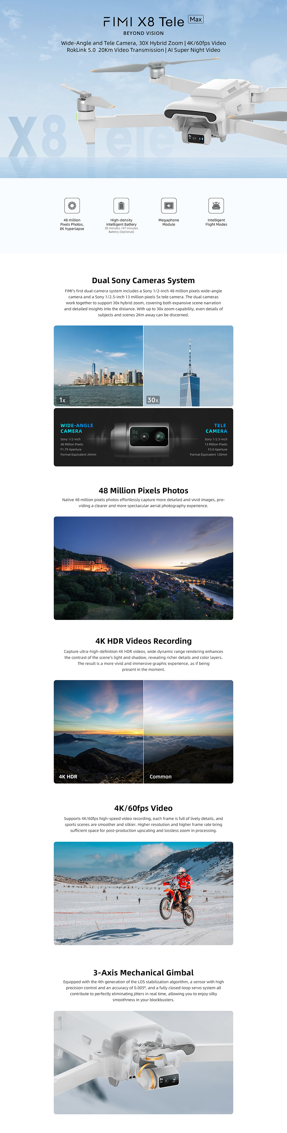FIMI X8 TELE MAX on GPS-nelikopteri, jossa on RokLink 5.0 -videolähetys jopa 20KM asti, kaksoiskamera 4K 60fps -tallennuksella, jopa 30X zoom, 3-akselinen mekaaninen gimbaali ja jopa 47 mins lentoaika Intelligent Flight Battery Plus -akun kanssa.
