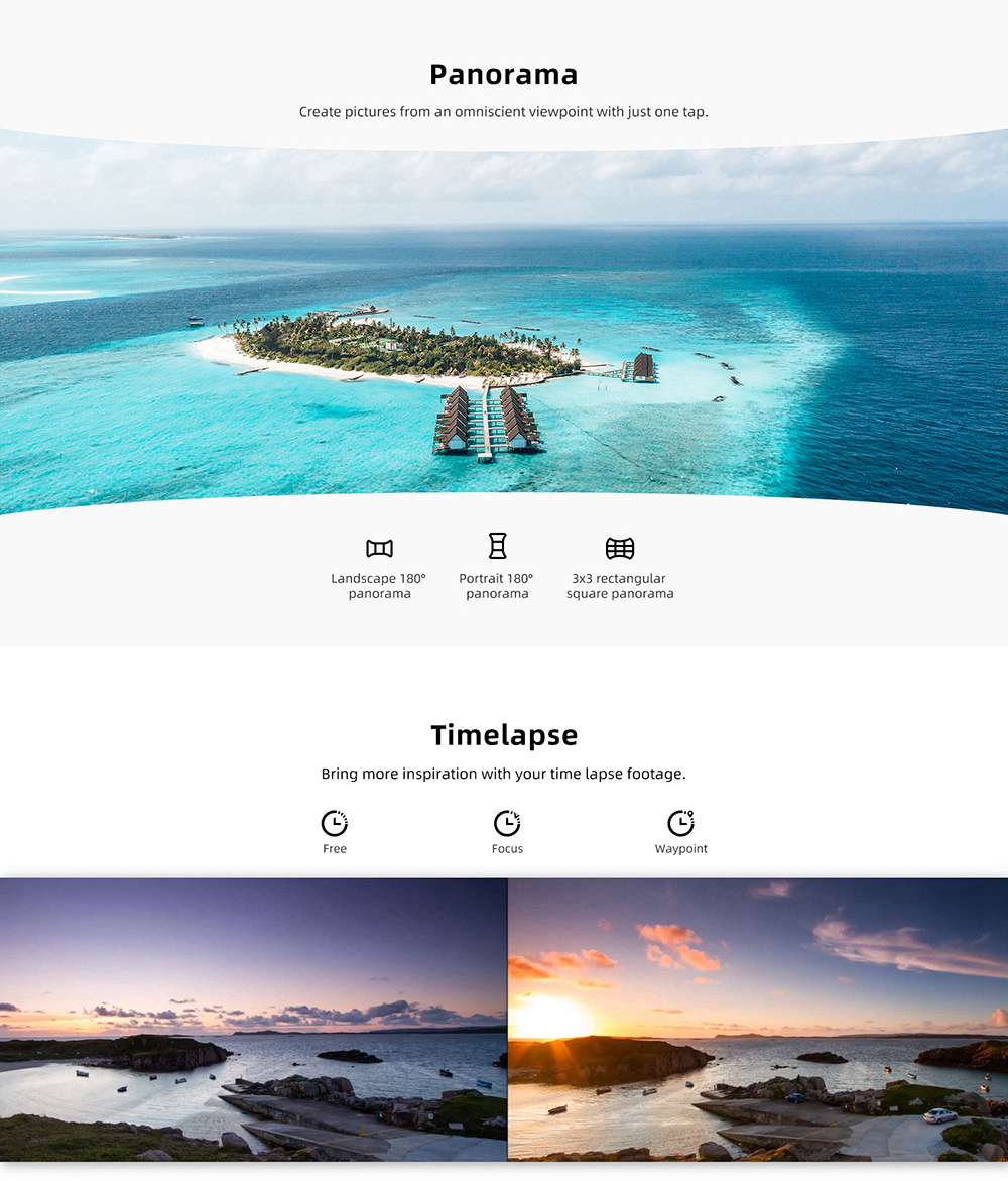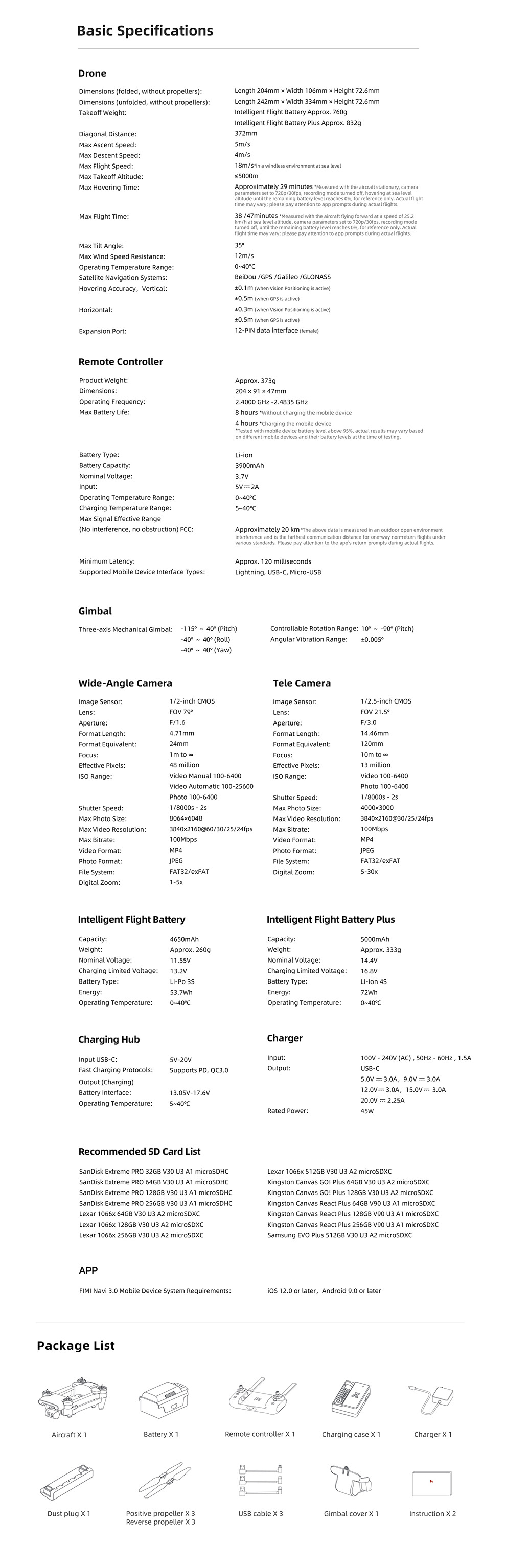 | Suurin leijunta-aika | Noin 29 minuuttia (Mitattu, kun ilma-alus on paikallaan, kameran asetukset 720p/30fps, tallennustila pois päältä, leijunta merenpinnan tasolla, kunnes akun varaus laskee 0%:iin, vain viitteellinen tieto. Todellinen lentoaika voi vaihdella, seuraa sovelluksen ilmoituksia lennon aikana.) |