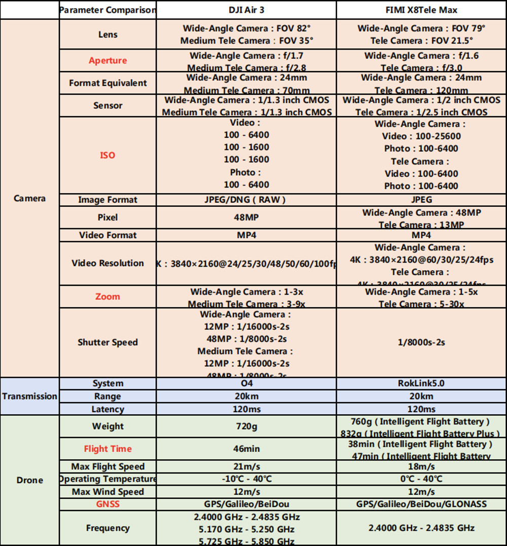FIMI:n kaksoiskamerajärjestelmä sisältää 1/2-inch 48 miljoonan pikselin laajakulmakameran ja 1/2.5-inch 13 miljoonan pikselin 5x telekameran. Kamerat toimivat yhdessä ja tukevat 30x hybridi-zoomia, joka kattaa sekä laajat maisemat että yksityiskohtaisen kuvaamisen kauempaa. Jopa 30x zoomin ansiosta yksityiskohtia voidaan erottaa jopa 2KM etäisyydeltä.