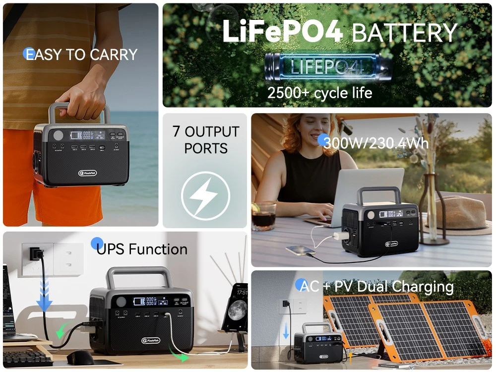 Flashfish BP030B on kompakti ja hiljainen varavirtalähde retkeilyyn, mökille ja kotitalouden varavirtakäyttöön. Kestävä 230.4Wh LiFePO4-akku ja 300W lähtöteho tarjoavat luotettavaa virtaa esimerkiksi kannettaville tietokoneille, kameroille, minijääkaapeille ja muille pienlaitteille sähkökatkosten tai ulkoiluretkien aikana.