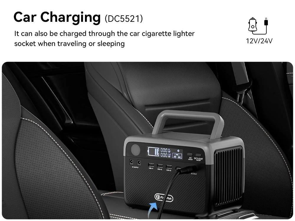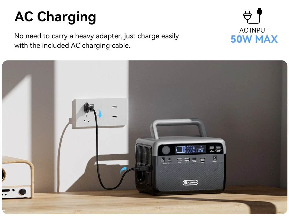 BP030B-generaattori tukee samanaikaista latausta 50W AC-tulon ja 40W DC-tulon kautta, jolloin akku voidaan ladata täyteen noin 3 tunnissa. Varavirtalähdettä voi ladata myös auton 12V-pistorasiasta (ei sisälly) tai Flashfish 100W -aurinkopaneelilla (ei sisälly).