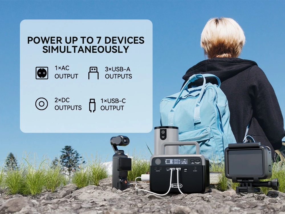 BP030B-kannettavassa generaattorissa on yhteensä 7 ulostuloa: 1 AC-ulostulo (230V/50Hz/300W, muunnettu siniaalto), 1 USB-C (5V/3A), 3 USB-A (5V/2.4A) ja 2 DC 12V/10A -lähtöä. Monipuoliset latausmahdollisuudet kattavat useimmat laitteet, joten sinun ei tarvitse kilpailla perheen tai ystävien kanssa latauspaikoista kotona tai ulkona.