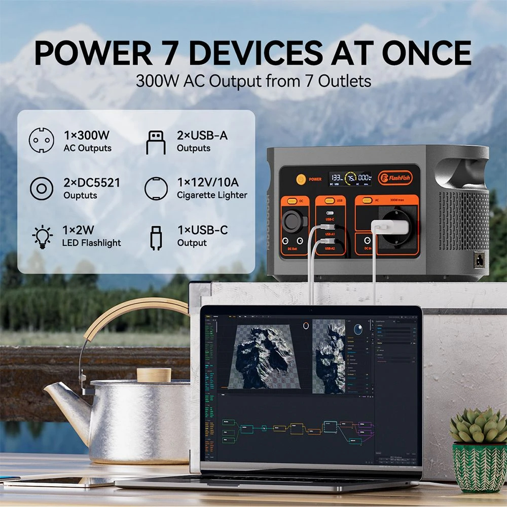 Laite tuottaa tasaista virtaa 300W puhtaan siniaallon invertterillä (huipputeho 600W), 60W USB-C PD -liitännällä ja 18W USB-A-lähdöillä. Se sopii esimerkiksi kannettaville tietokoneille, kameroille, pienille kodinkoneille ja valaistukseen. Sisäänrakennettu 3-in-1 LED-valo (jatkuva, puoliteho, SOS) tekee siitä käytännöllisen kumppanin retkille ja pimeään aikaan.