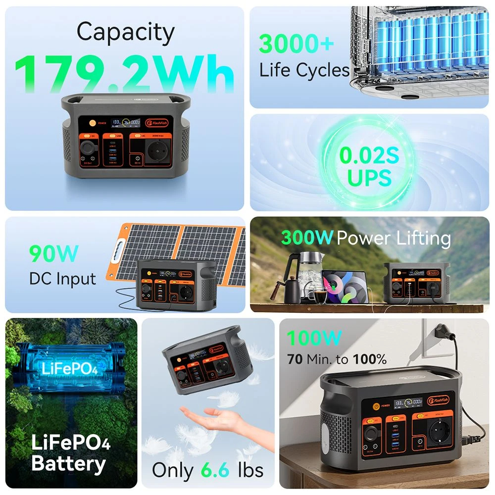 Flashfish E103 on varustettu 179.2Wh LiFePO4-akulla, jolla on yli 3000 lataussykliä. Se tarjoaa luotettavan ja pitkäikäisen virtaratkaisun retkeilyyn, ulkoiluun ja hätävaravoimaksi. LiFePO4-tekniikka parantaa kestävyyttä ja turvallisuutta sekä pidentää akun käyttöikää, mikä tekee laitteesta sopivan päivittäiseen käyttöön ja off-grid-olosuhteisiin.