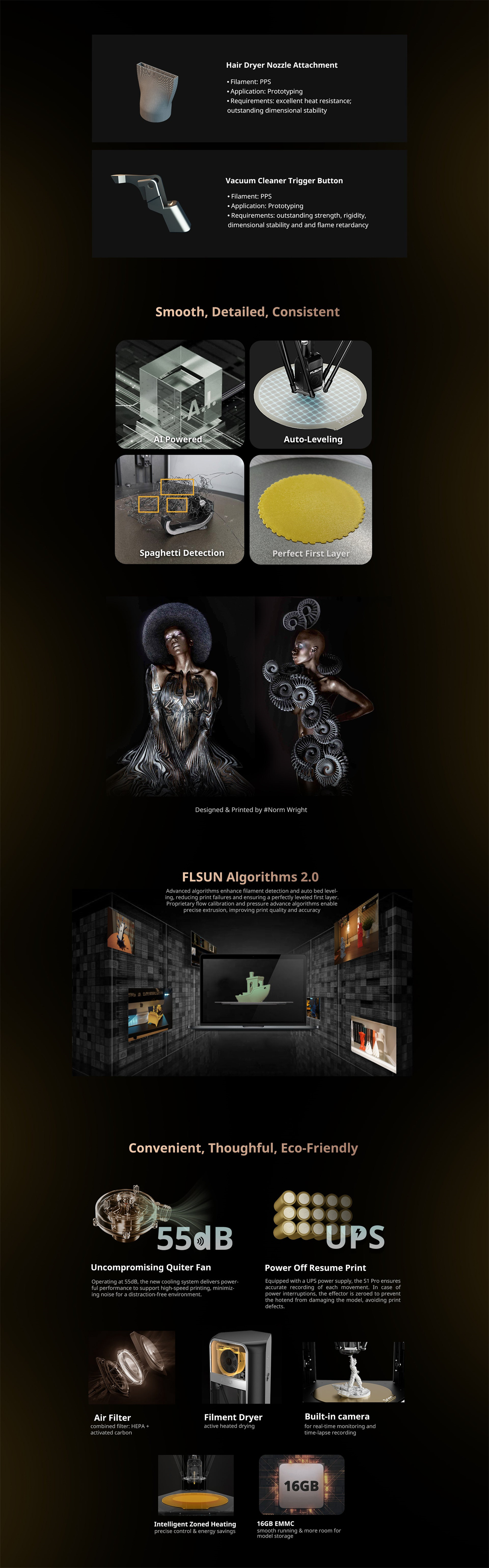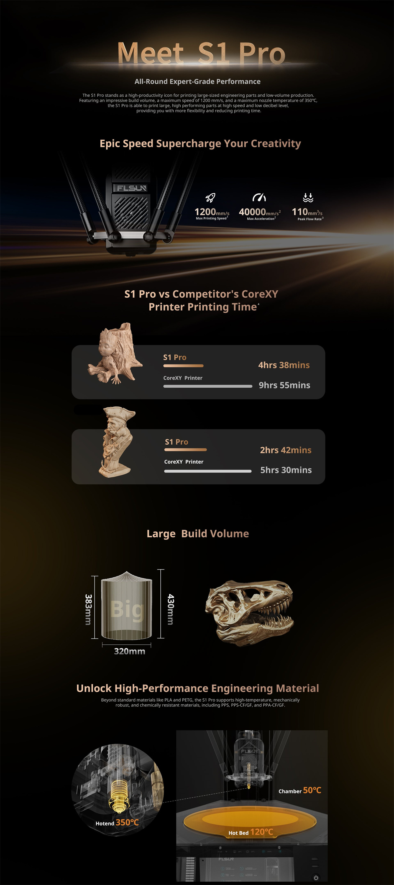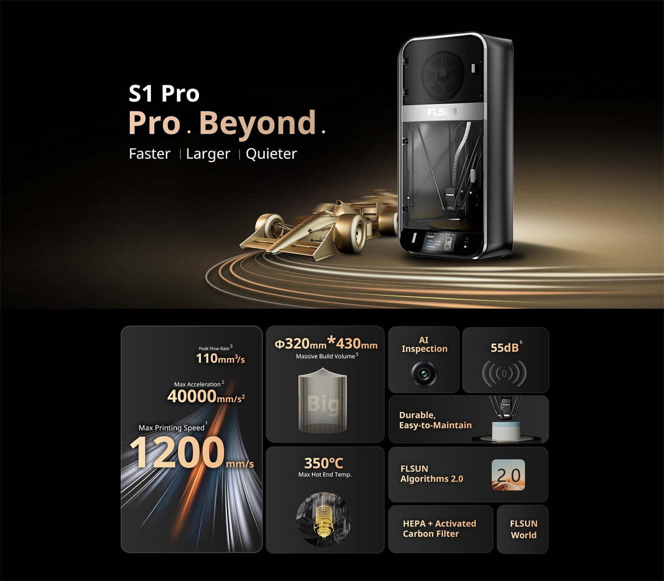 Nopea ja vakaa FLSUN S1 Pro on suljetulla kammiorakenteella varustettu 3D-tulostin, jossa on suuri rakennustilavuus Φ320 x 430 mm, metallinen kuumapää jopa 350°C saakka ja tekoälypohjainen valvonta laadun varmistamiseen. Hiljainen käynti (55dB), älykäs vyöhykekuumennus ja kattava anturointi tukevat luotettavaa tulostusta niin PLA:lla kuin vaativammillakin materiaaleilla.