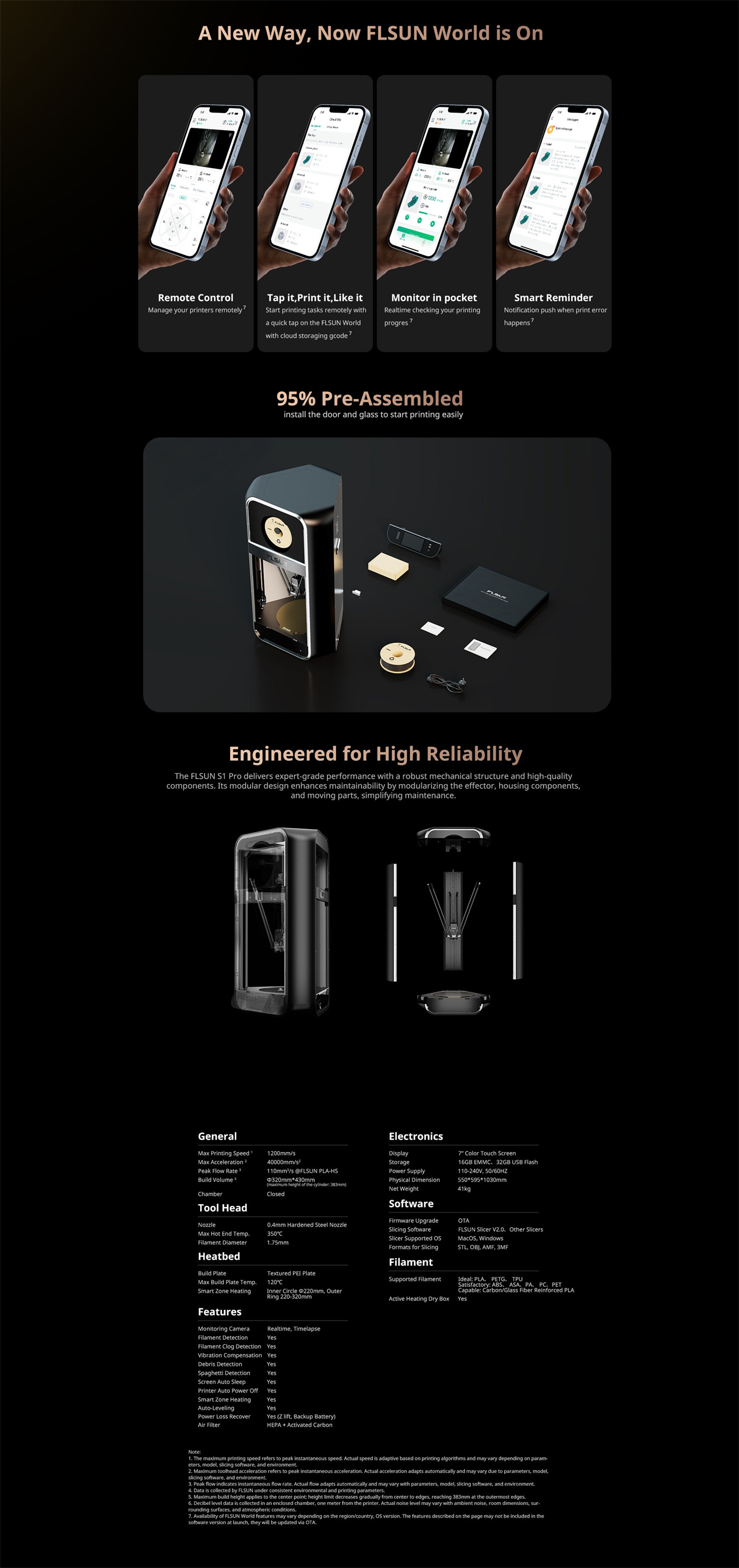 | Ohjelmisto | Laiteohjelmiston päivitys: OTA Viipalointiohjelmisto: FLSUN Slicer V2.0, muut viipalointiohjelmistot Viipalointiohjelmiston tuetut käyttöjärjestelmät: MacOS, Windows Viipaloinnin tiedostomuodot: STL, OBJ, AMF, 3MF |