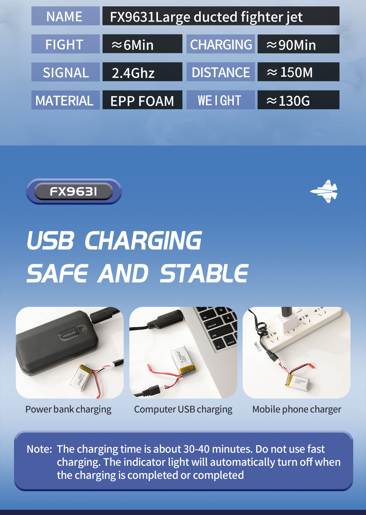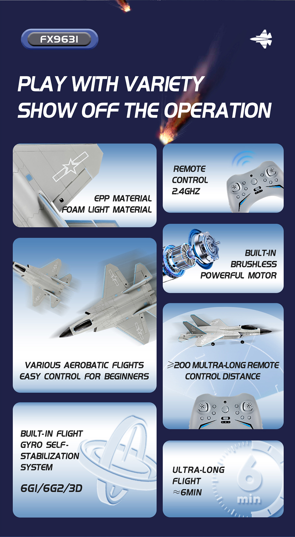 Flybear FX9631 J-35 Fighter on kevyt ja kestävä radio-ohjattava suihkuhävittäjän mallinen lennokki, jossa on harjaton moottori ja kanavoitu puhallinrakenne. EPP-vaahtomuovista valmistettu runko kestää hyvin kolhuja, ja 6-akselinen gyro tekee lentämisestä vakaampaa myös vähemmän kokeneille harrastajille.