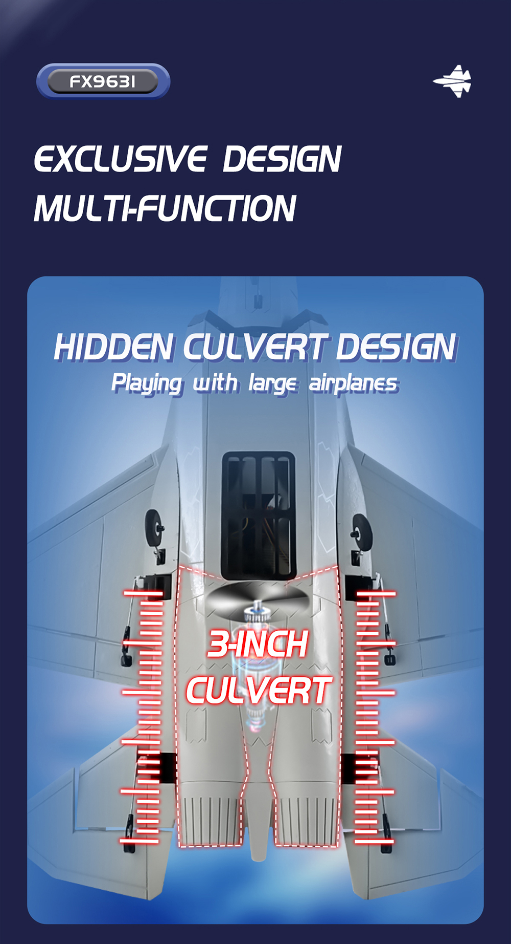 2. Ainutlaatuinen 3-tuumainen kanavoitu puhallin: kompakti rakenne helpottaa lennättämistä myös pienemmillä alueilla.