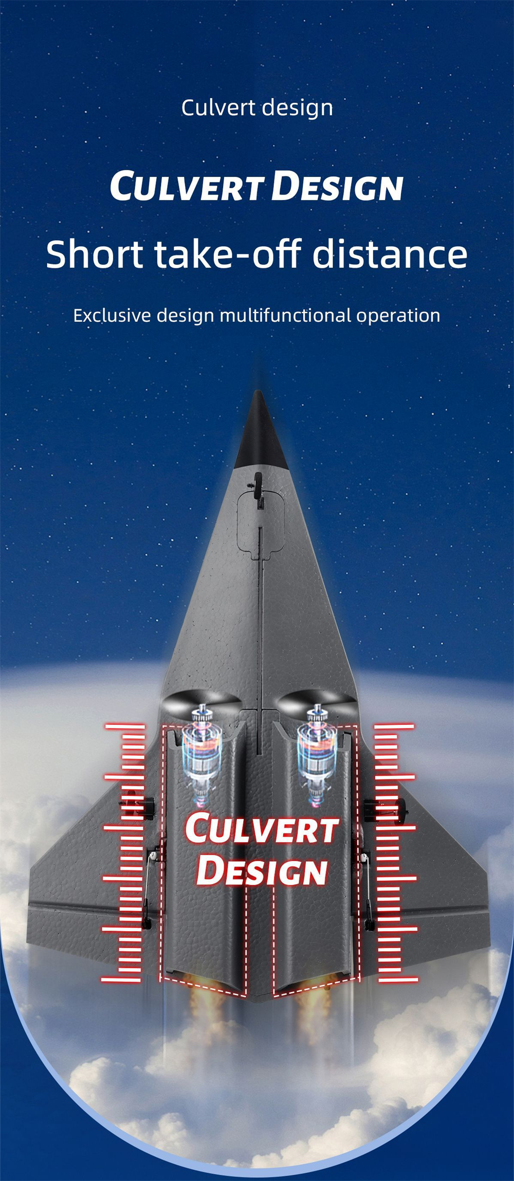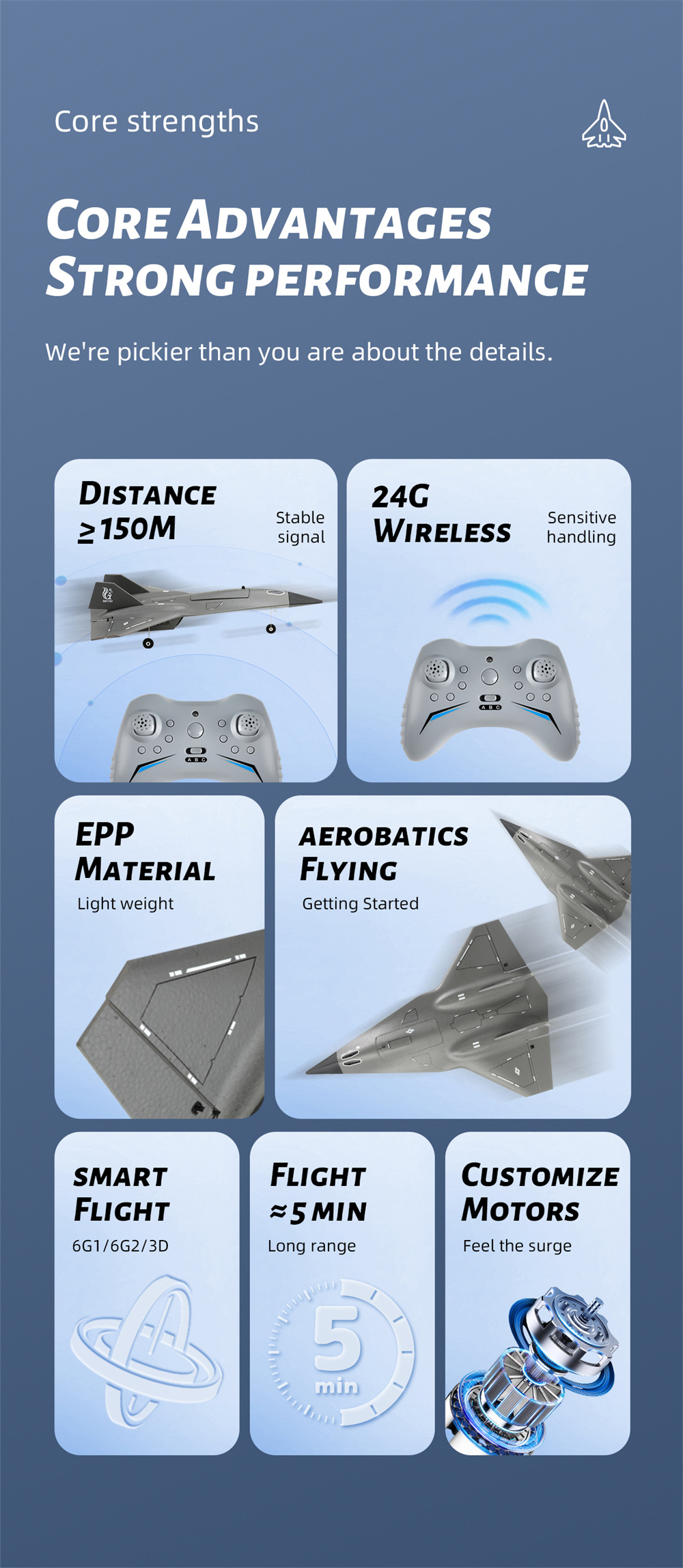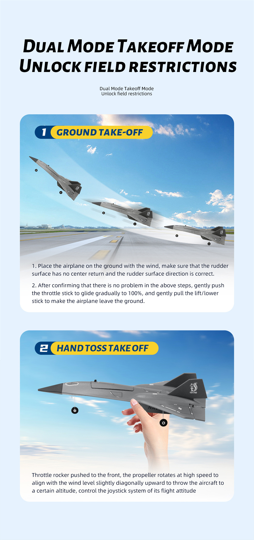 Nelikanavainen ohjaus ja työntävä kaksoismoottoriratkaisu tarjoavat riittävästi tehoa ja ohjattavuutta, jotta voit harjoitella nousuja, laskuja ja käännöksiä turvallisesti. Pakkauksessa on mukana kaikki, mitä tarvitset lentoonlähtöön, lukuun ottamatta liimaa ja kauko-ohjaimen paristoja.