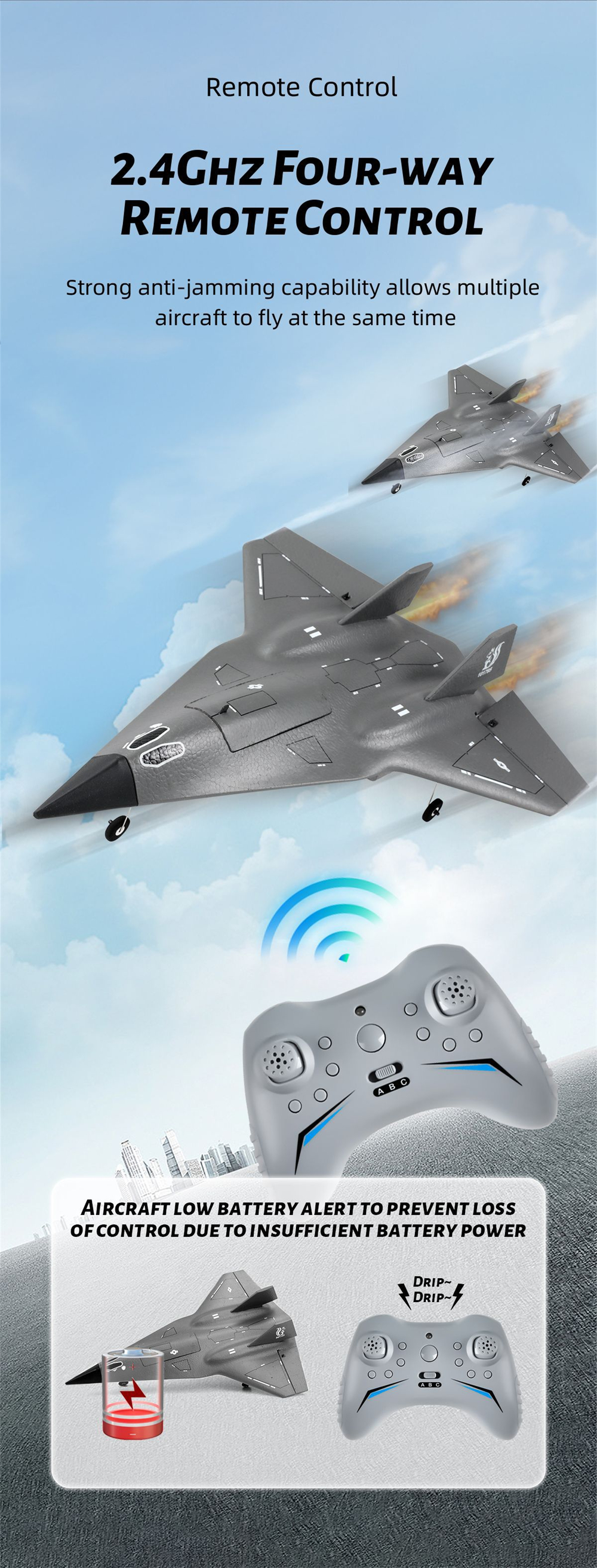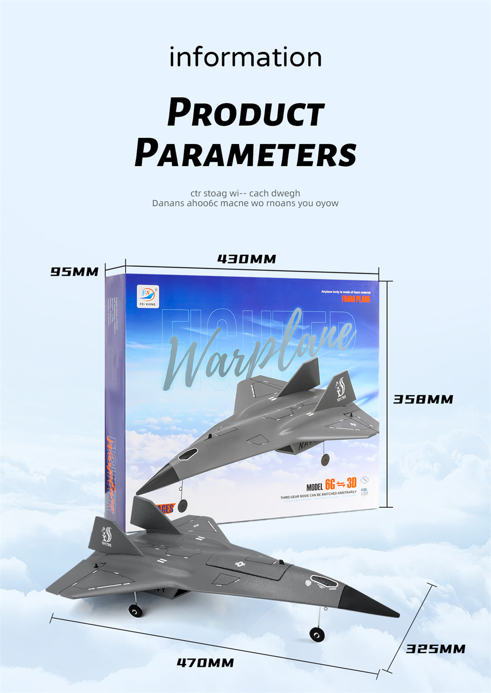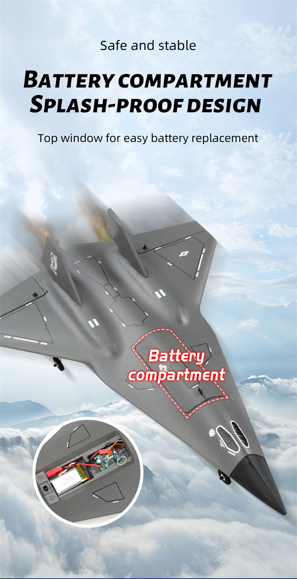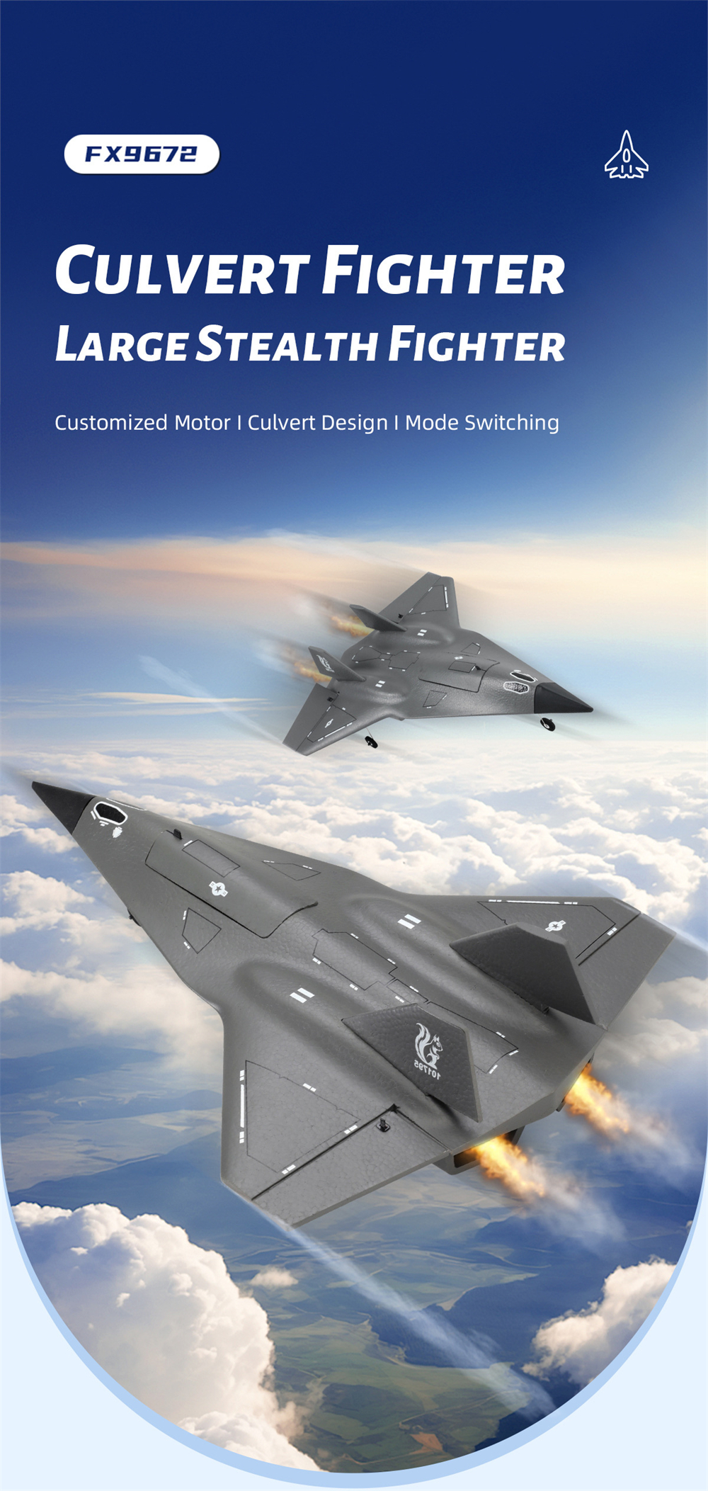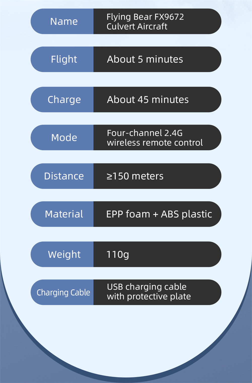 FlyBear FX9672 on kevyt ja helposti hallittava kauko-ohjattava lentokone, joka sopii erityisesti aloittelijoille ja harrastajille. Kestävästä EPP-vaahdosta ja ABS-muovista valmistettu runko kestää hyvin iskuja, ja sisäänrakennettu kuusiakselinen gyroskooppi auttaa pitämään lennon vakaana myös kokemattomissa käsissä.